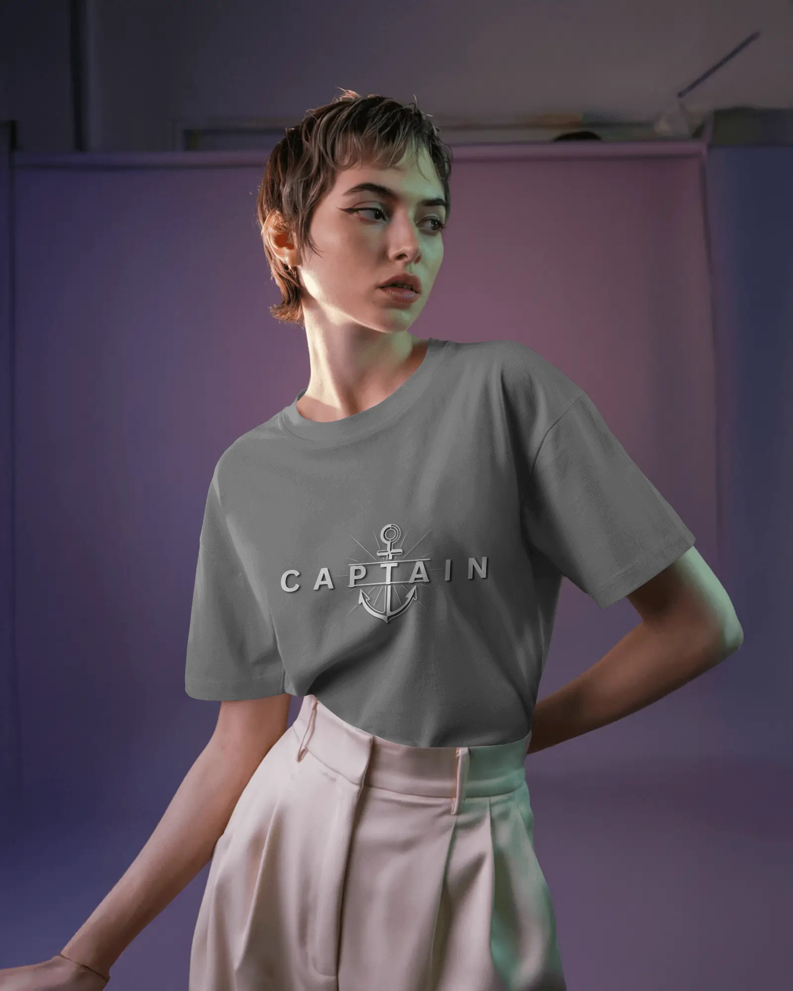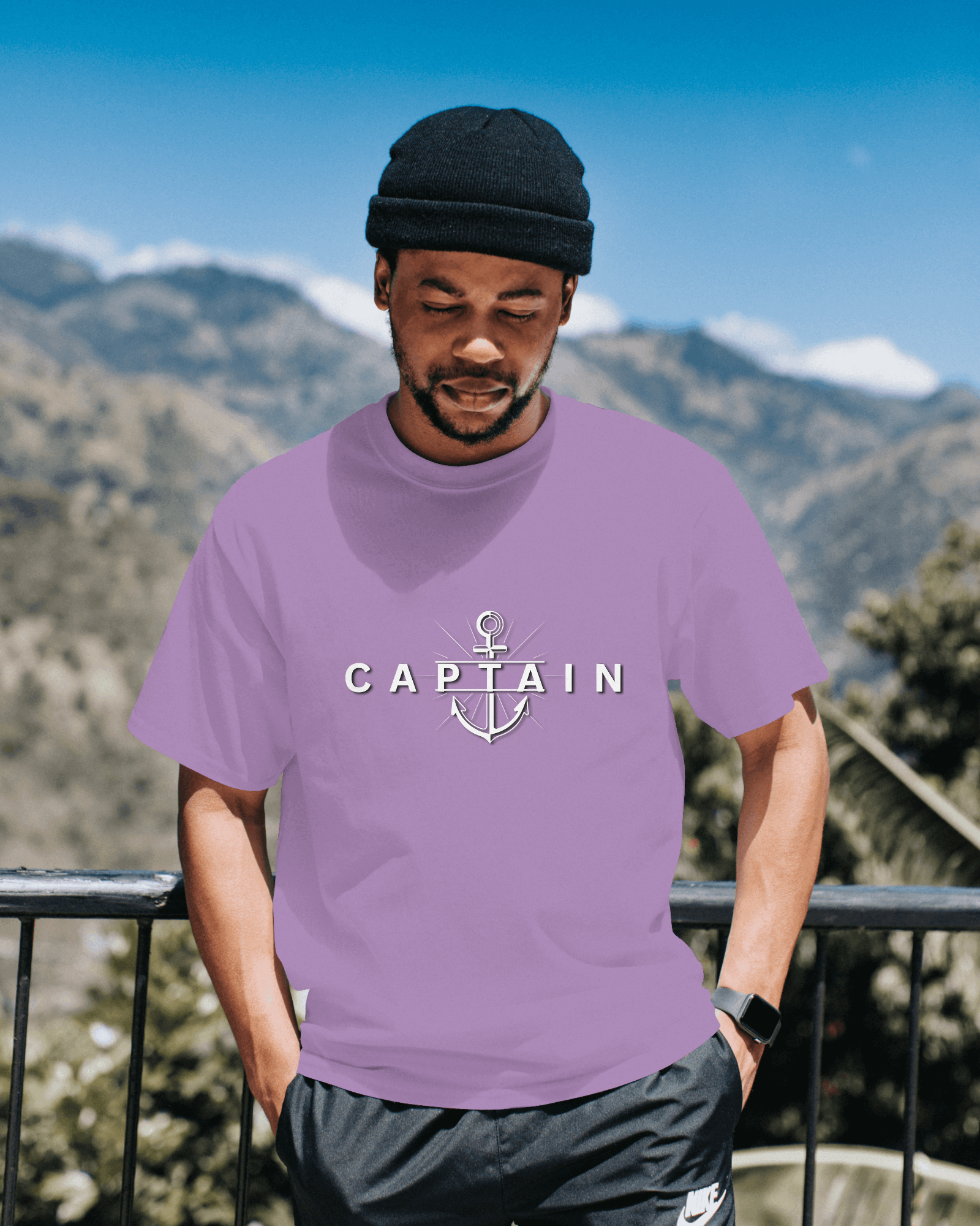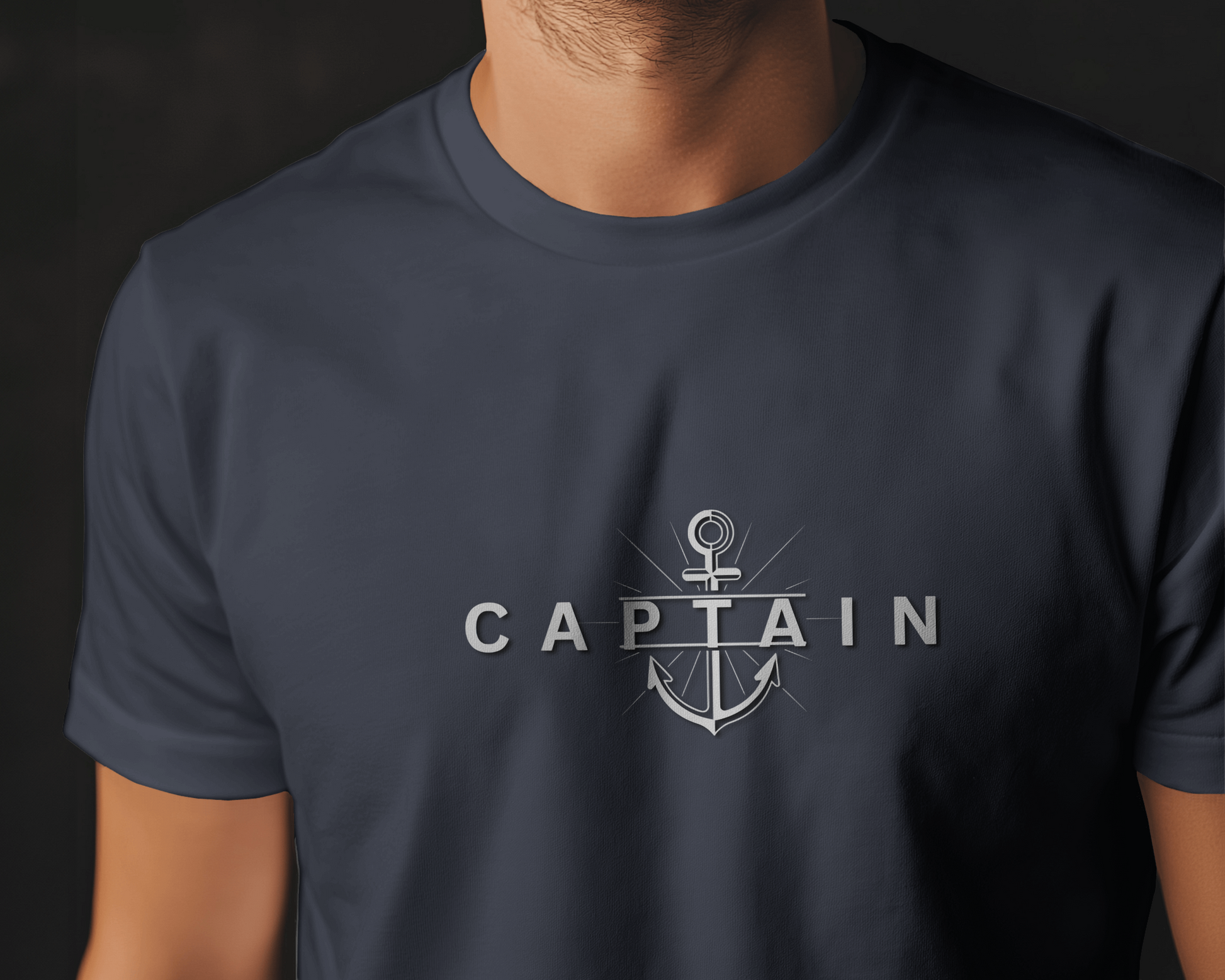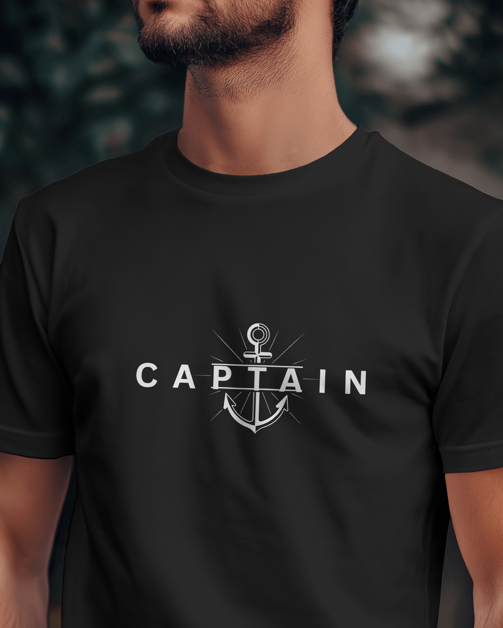 The compelling 'Captain' graphic, prominently featured on the chest, showcases the word 'CAPTAIN' boldly displayed with a striking anchor motif, symbolizing stability, hope, and leadership. This unique design blends classic nautical imagery with a powerful statement of authority and guidance, making it a compelling visual declaration of your commanding presence and adventurous spirit. With its classic regular fit, this tee offers a timeless silhouette that perfectly highlights the inspiring graphic.