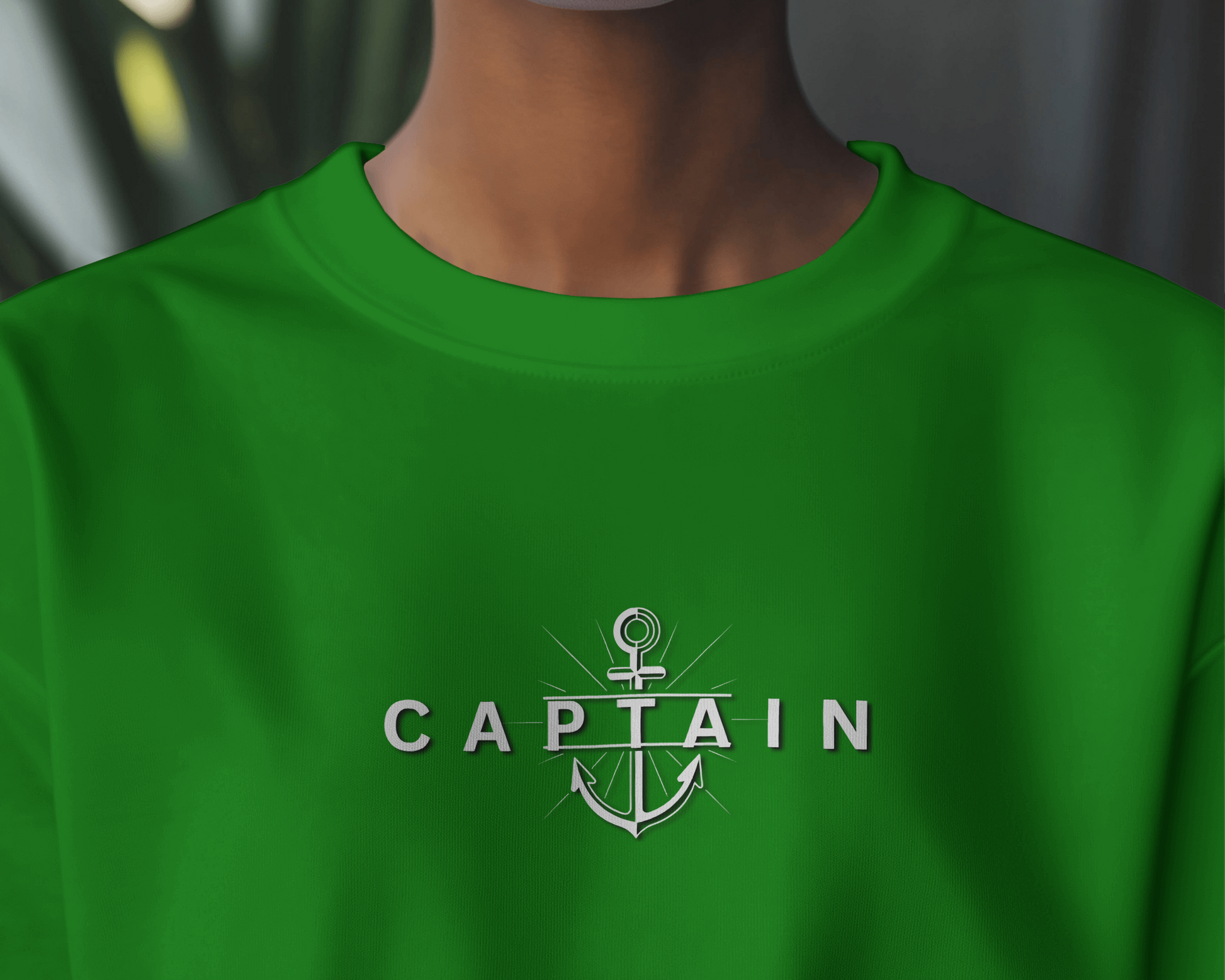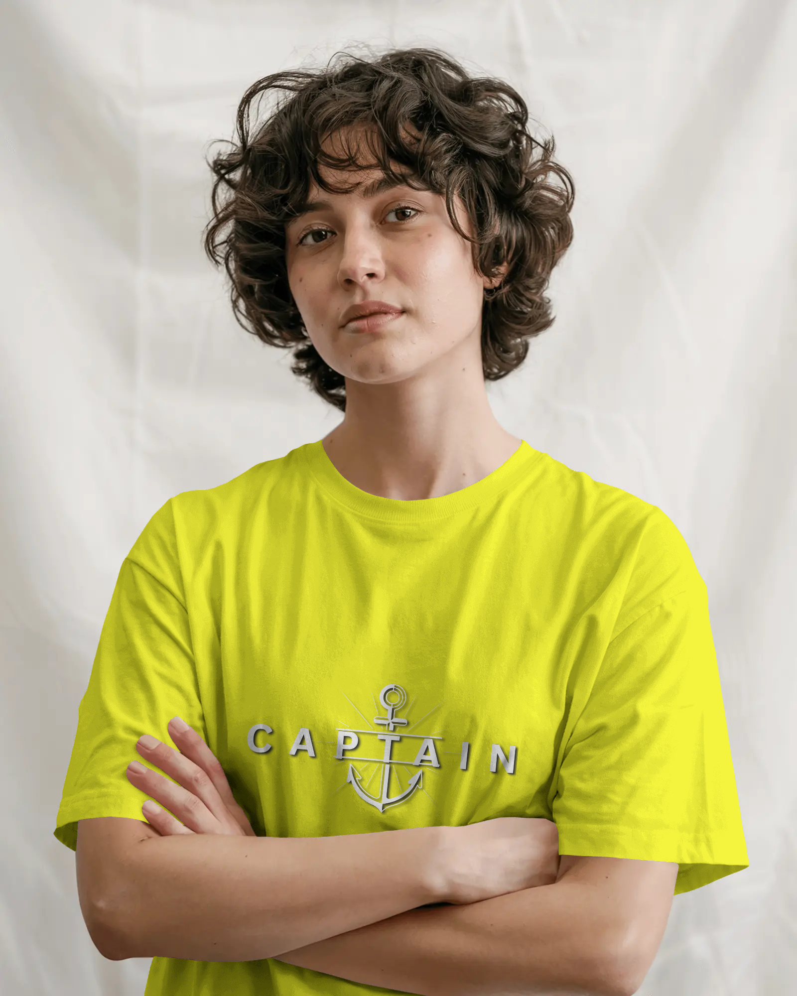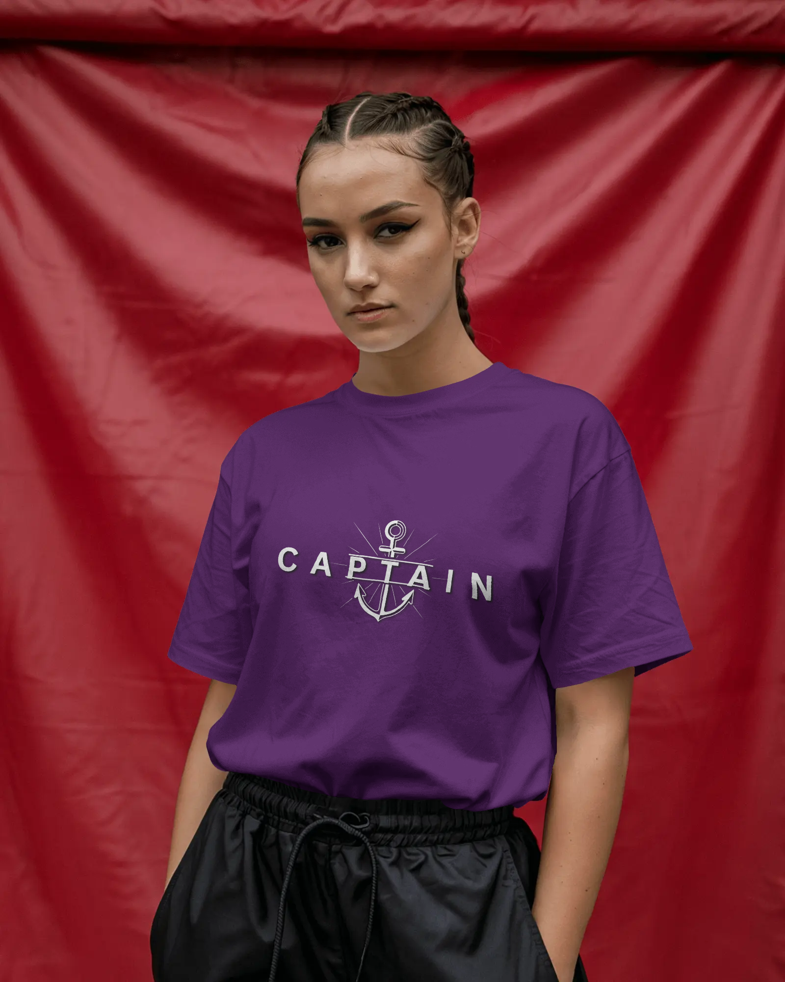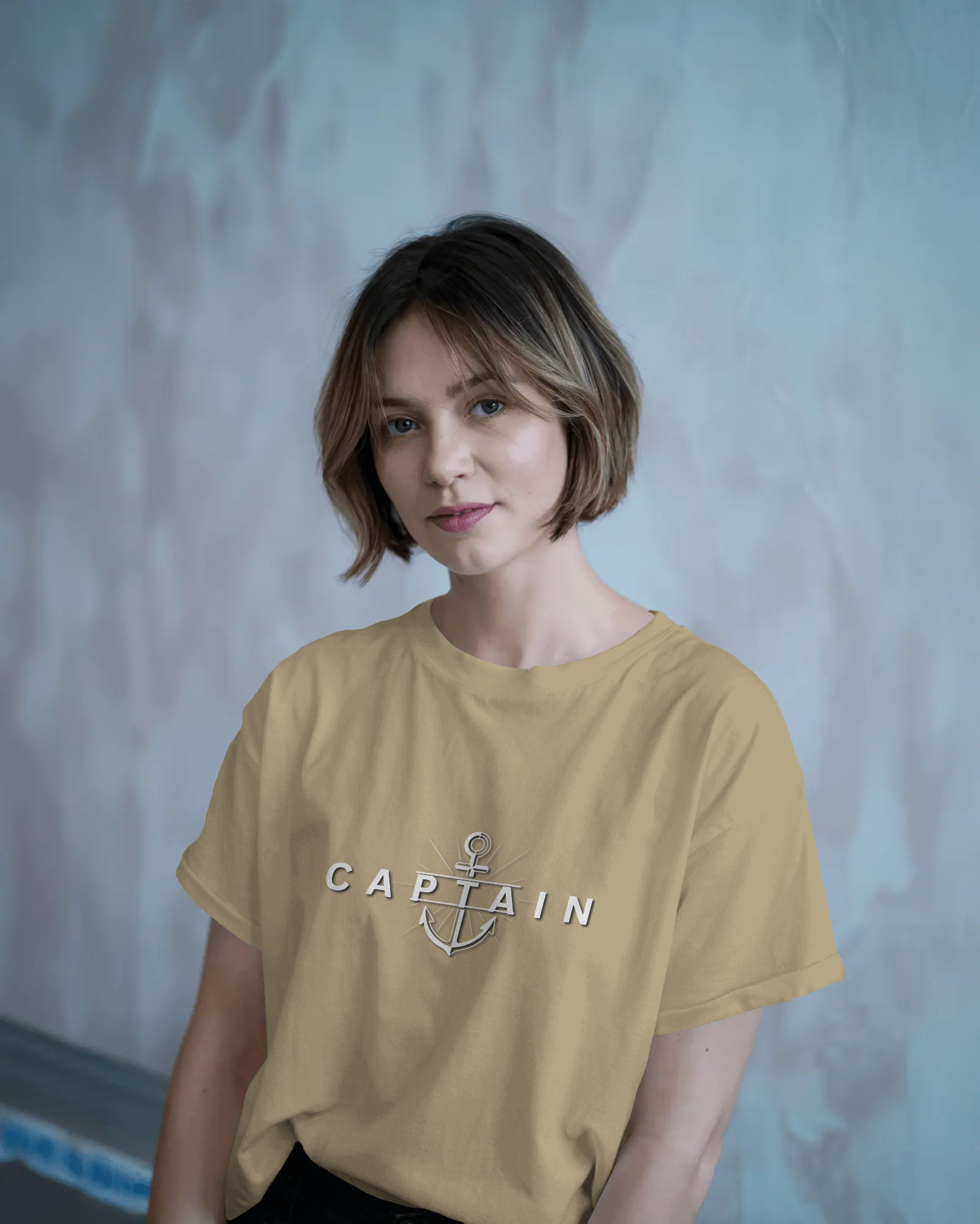 The compelling 'Captain' graphic, prominently featured on the chest, showcases the word 'CAPTAIN' boldly displayed with a striking anchor motif, symbolizing stability, hope, and leadership. This unique design blends classic nautical imagery with a powerful statement of authority and guidance, making it a compelling visual declaration of your commanding presence and adventurous spirit. With its classic regular fit, this tee offers a timeless silhouette that perfectly highlights the inspiring graphic.