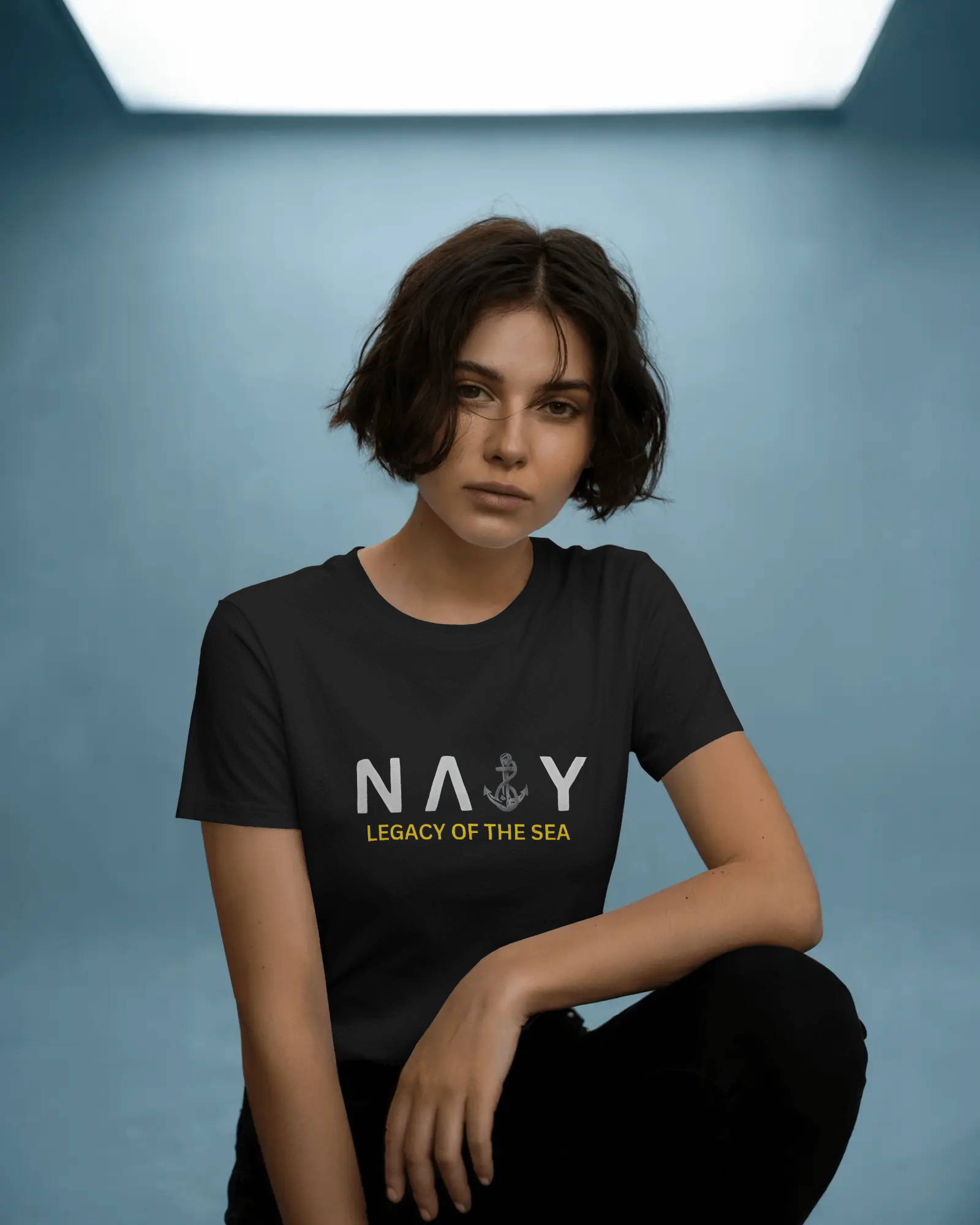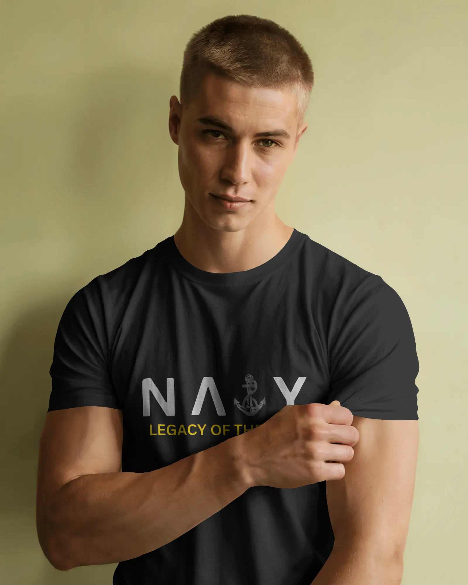 The compelling 'Navy: Legacy of the Sea' graphic, prominently featured on the chest, showcases the word 'NAVY' alongside a stylized anchor, symbolizing steadfastness and maritime strength, with the phrase 'LEGACY OF THE SEA' completing the powerful message. This unique design blends classic naval iconography with a tribute to the vast ocean's enduring history, making it a compelling visual declaration of your adventurous spirit and appreciation for maritime heritage. With its classic regular fit, this tee offers a timeless silhouette that perfectly highlights the inspiring graphic.