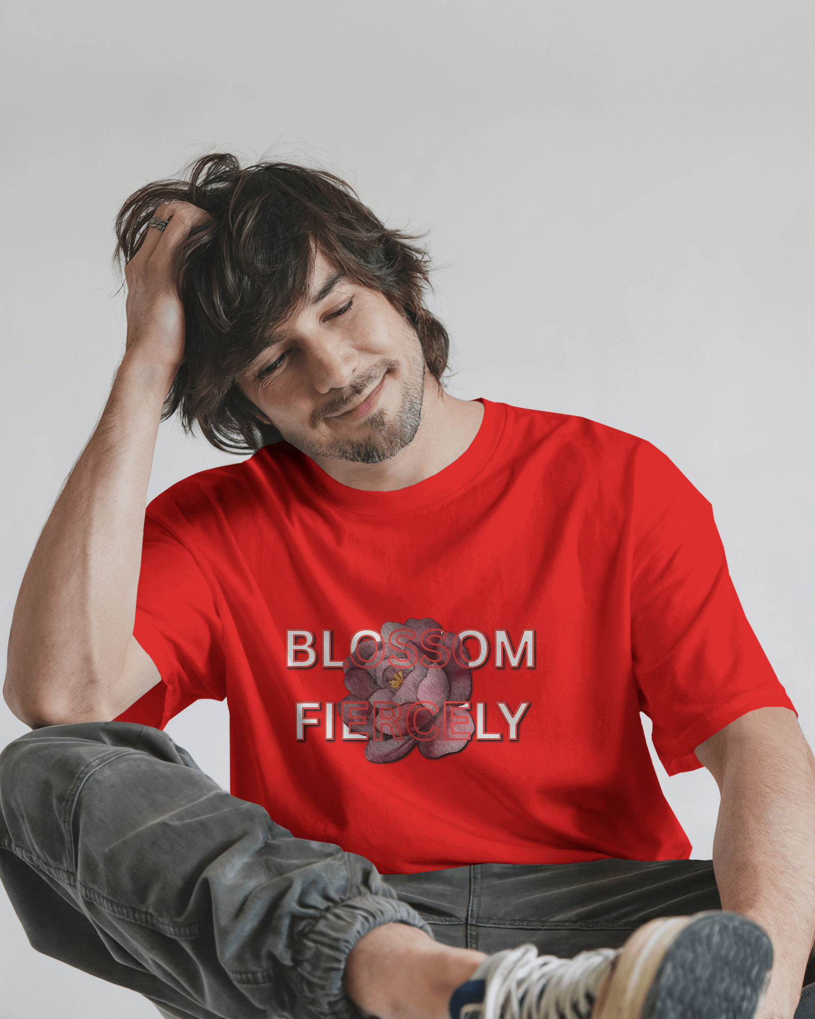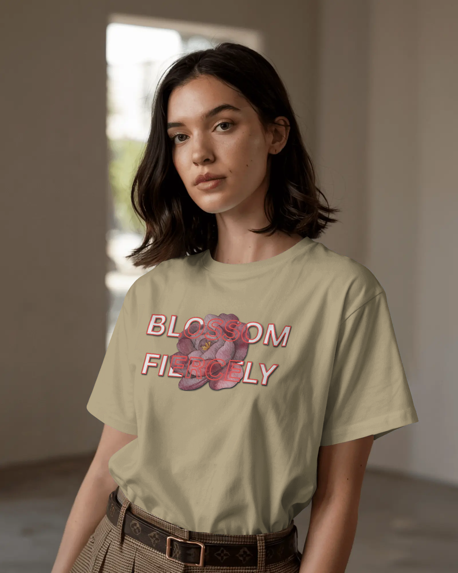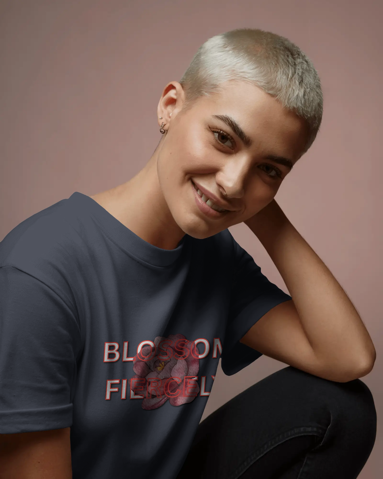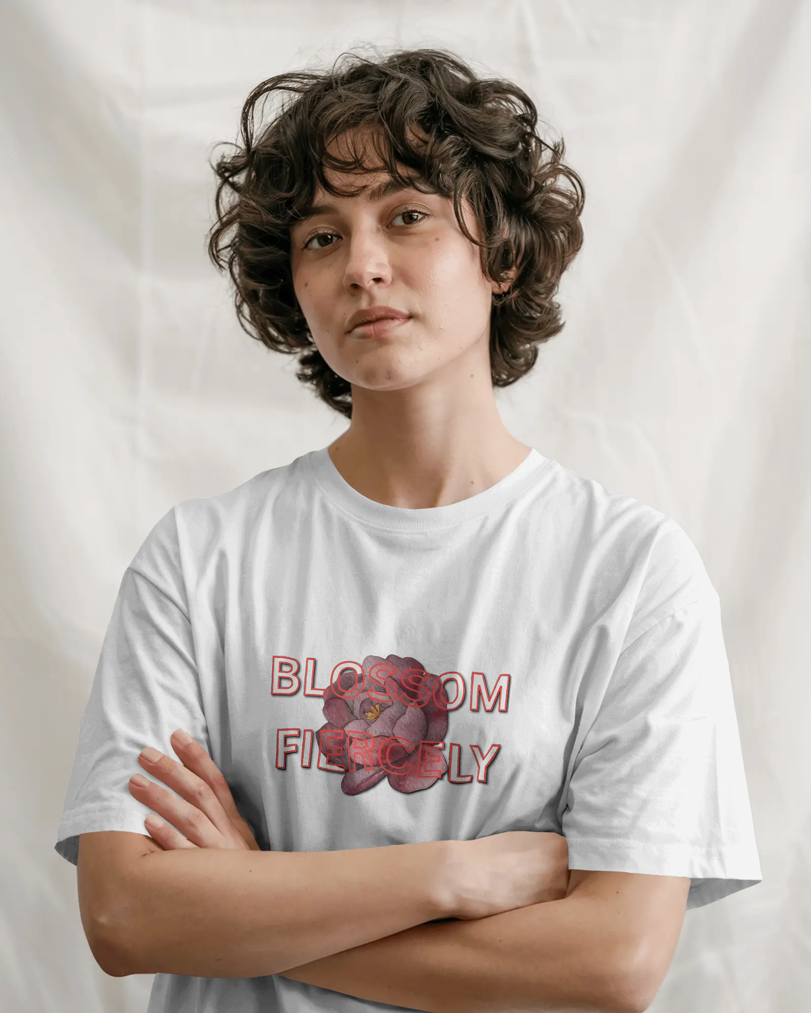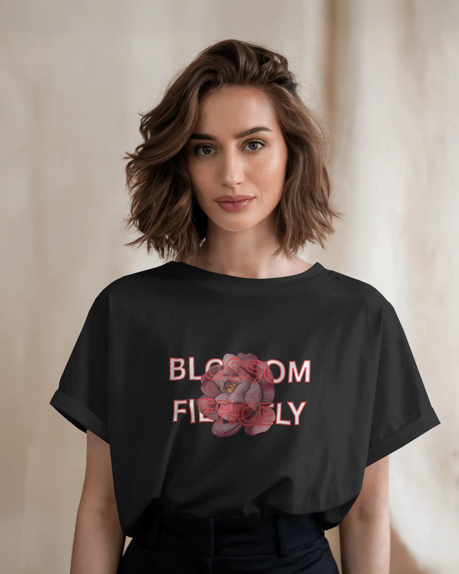 The compelling 'Blossom Fiercely' graphic, prominently featured on the chest, showcases the empowering text 'BLOSSOM FIERCELY' intertwined with a beautifully rendered floral design, symbolizing natural beauty and powerful emergence. This unique design blends delicate artistry with a strong, motivational statement, making it a compelling visual declaration of your vibrant spirit and confident growth. With its classic regular fit, this tee offers a timeless silhouette that perfectly highlights the inspiring graphic.