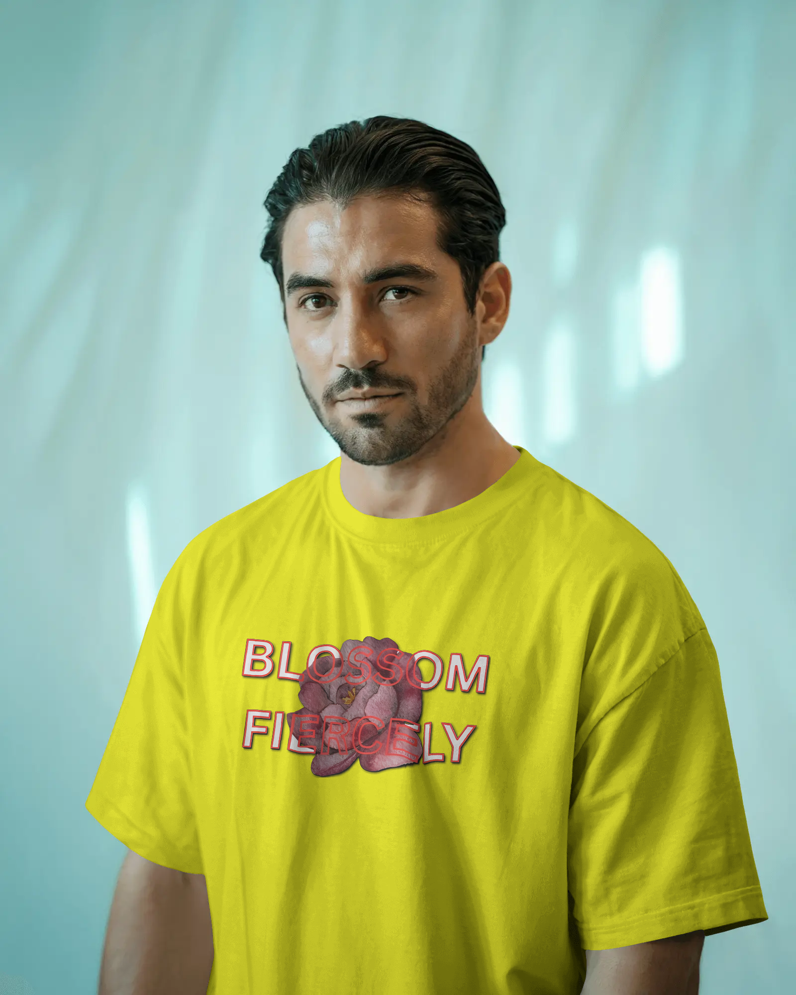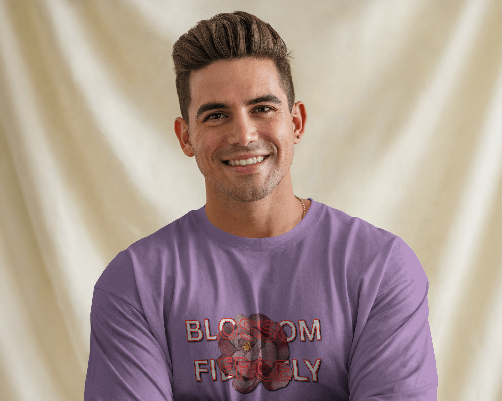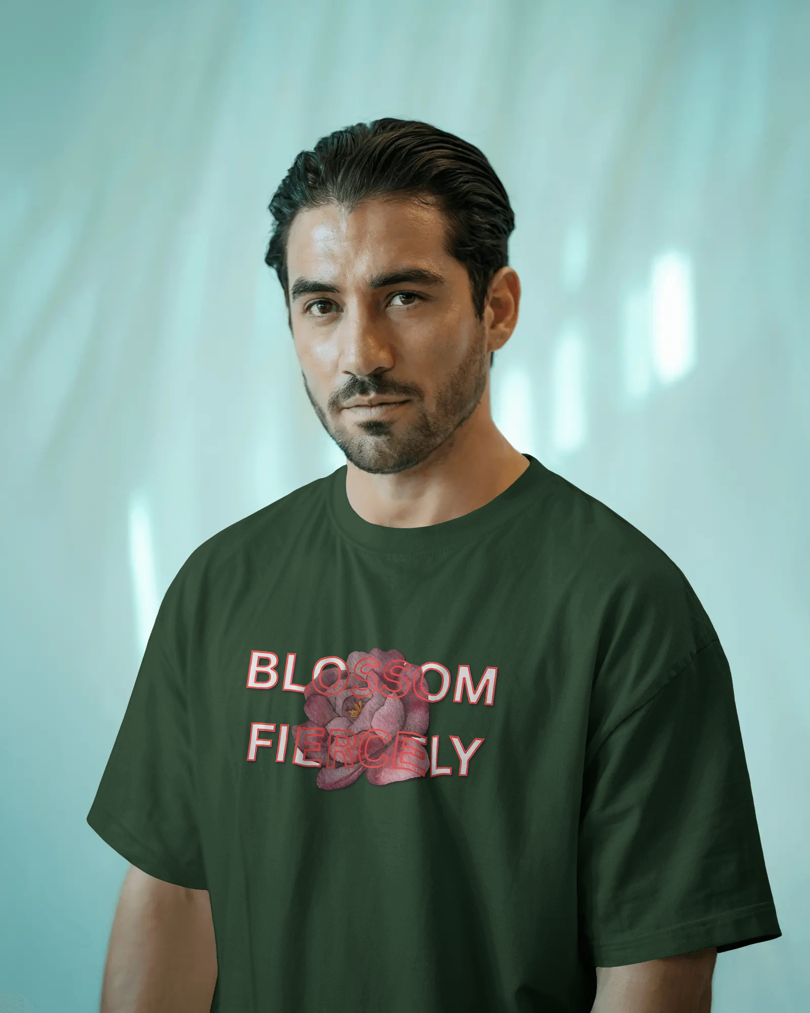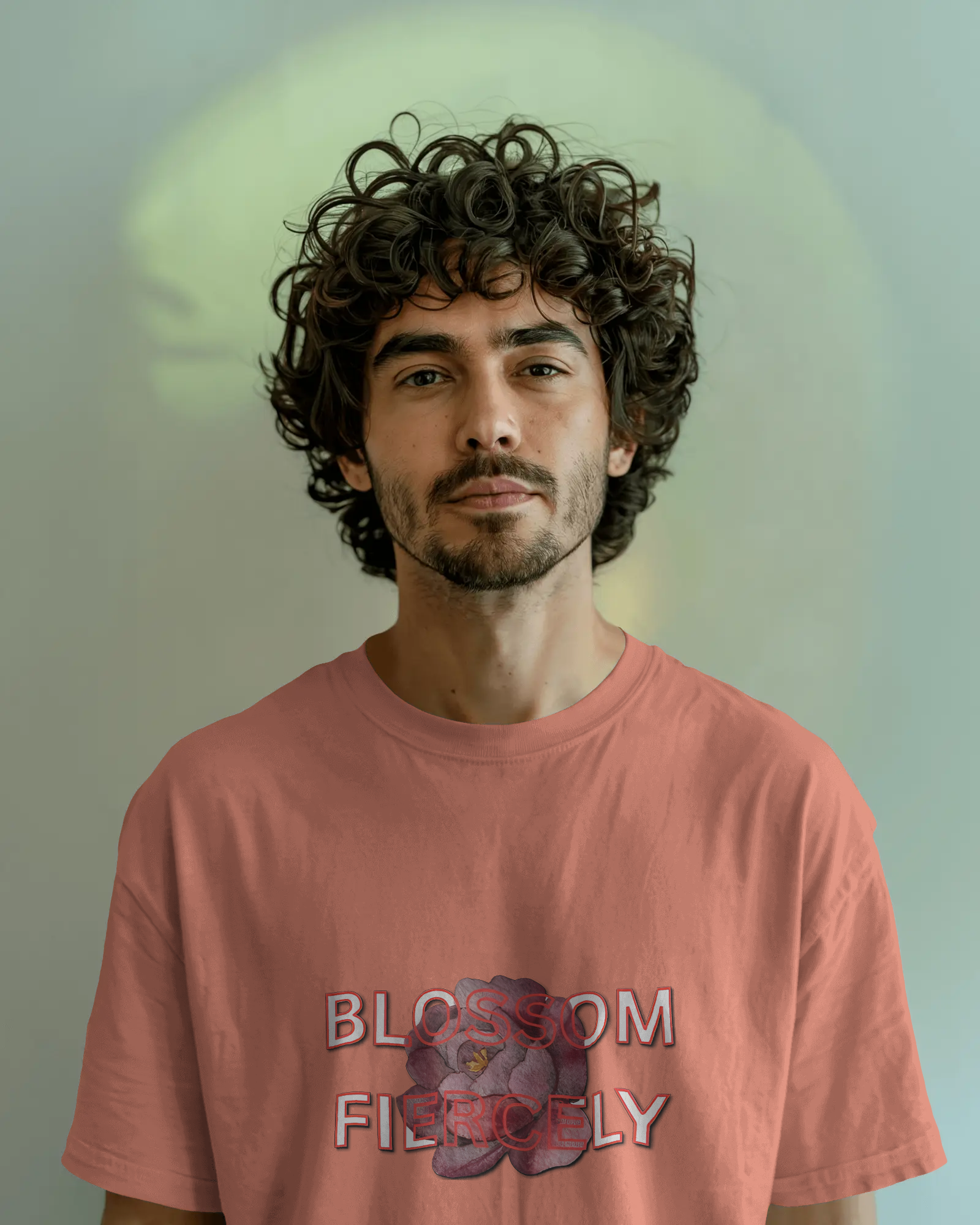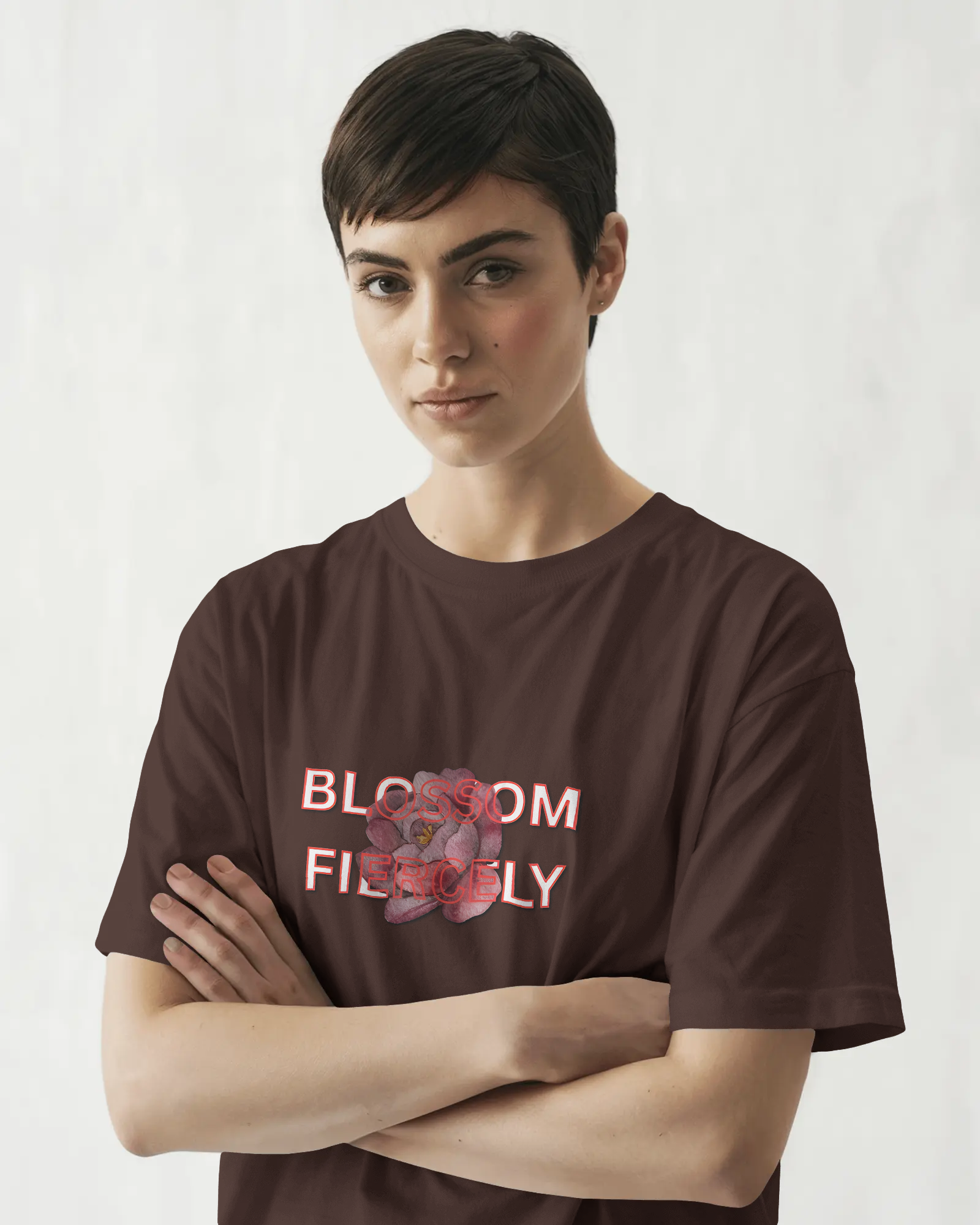 The compelling 'Blossom Fiercely' graphic, prominently featured on the chest, showcases the empowering text 'BLOSSOM FIERCELY' intertwined with a beautifully rendered floral design, symbolizing natural beauty and powerful emergence. This unique design blends delicate artistry with a strong, motivational statement, making it a compelling visual declaration of your vibrant spirit and confident growth. With its classic regular fit, this tee offers a timeless silhouette that perfectly highlights the inspiring graphic.