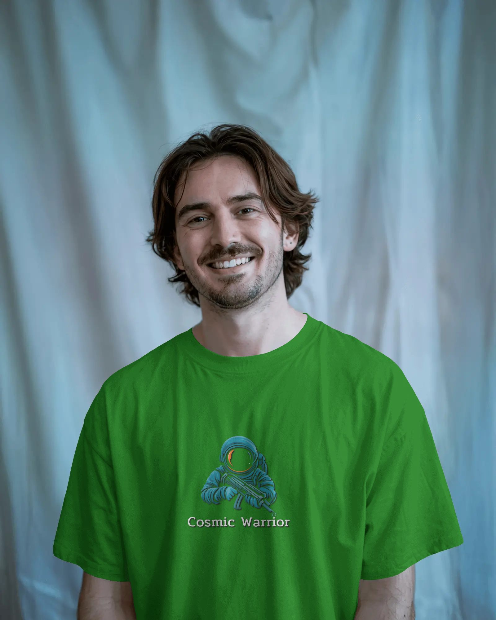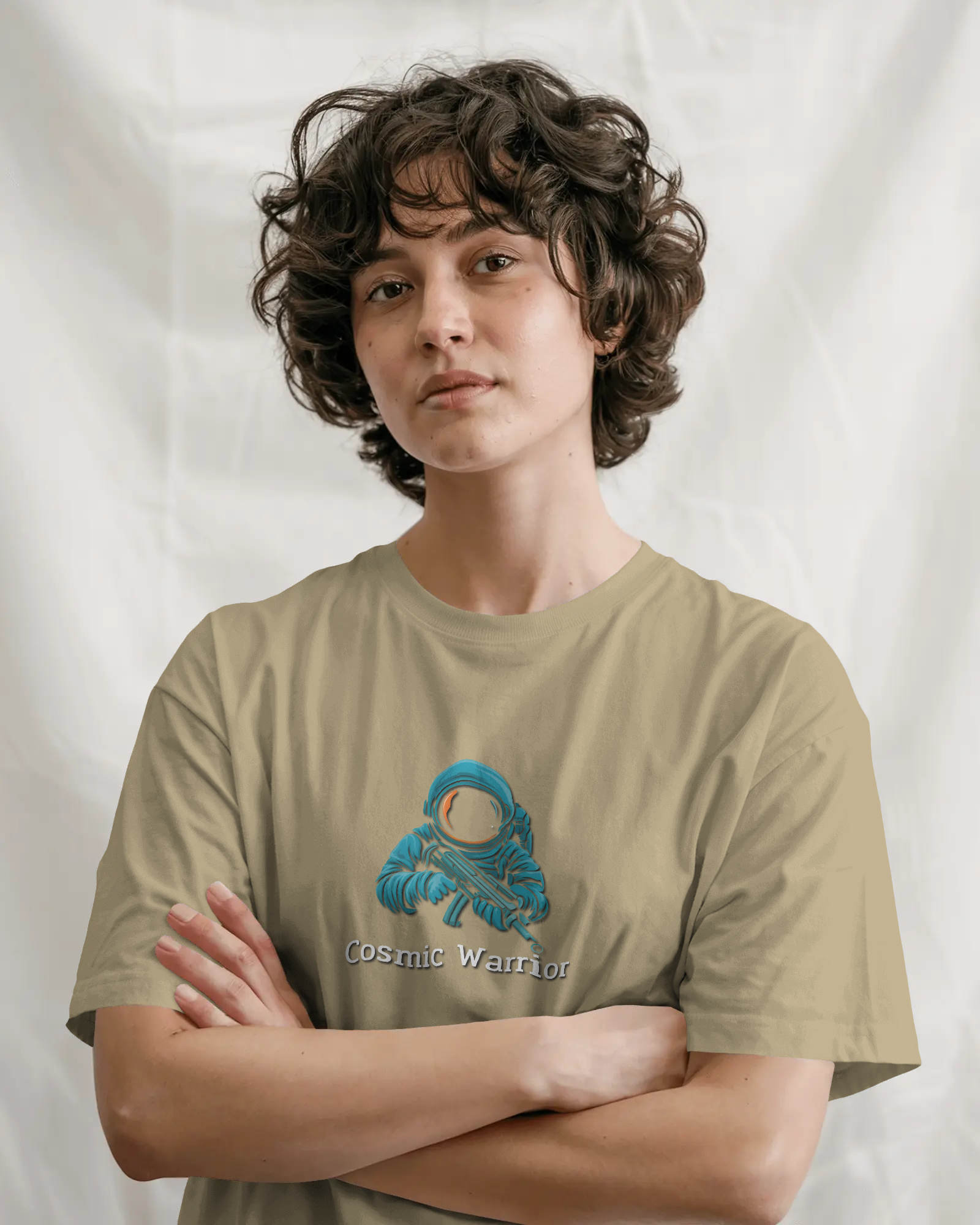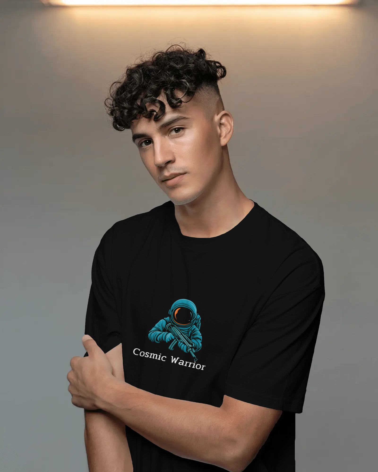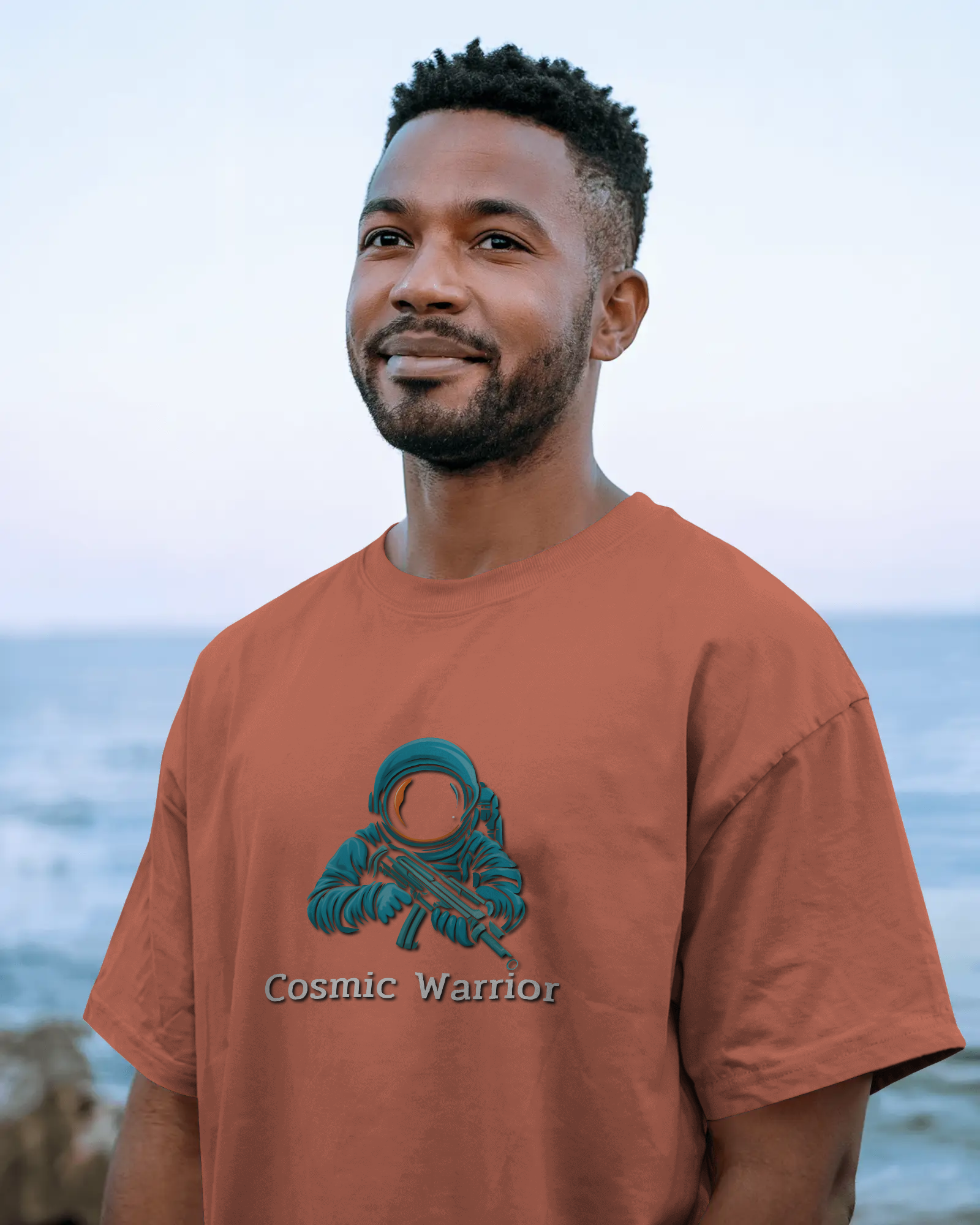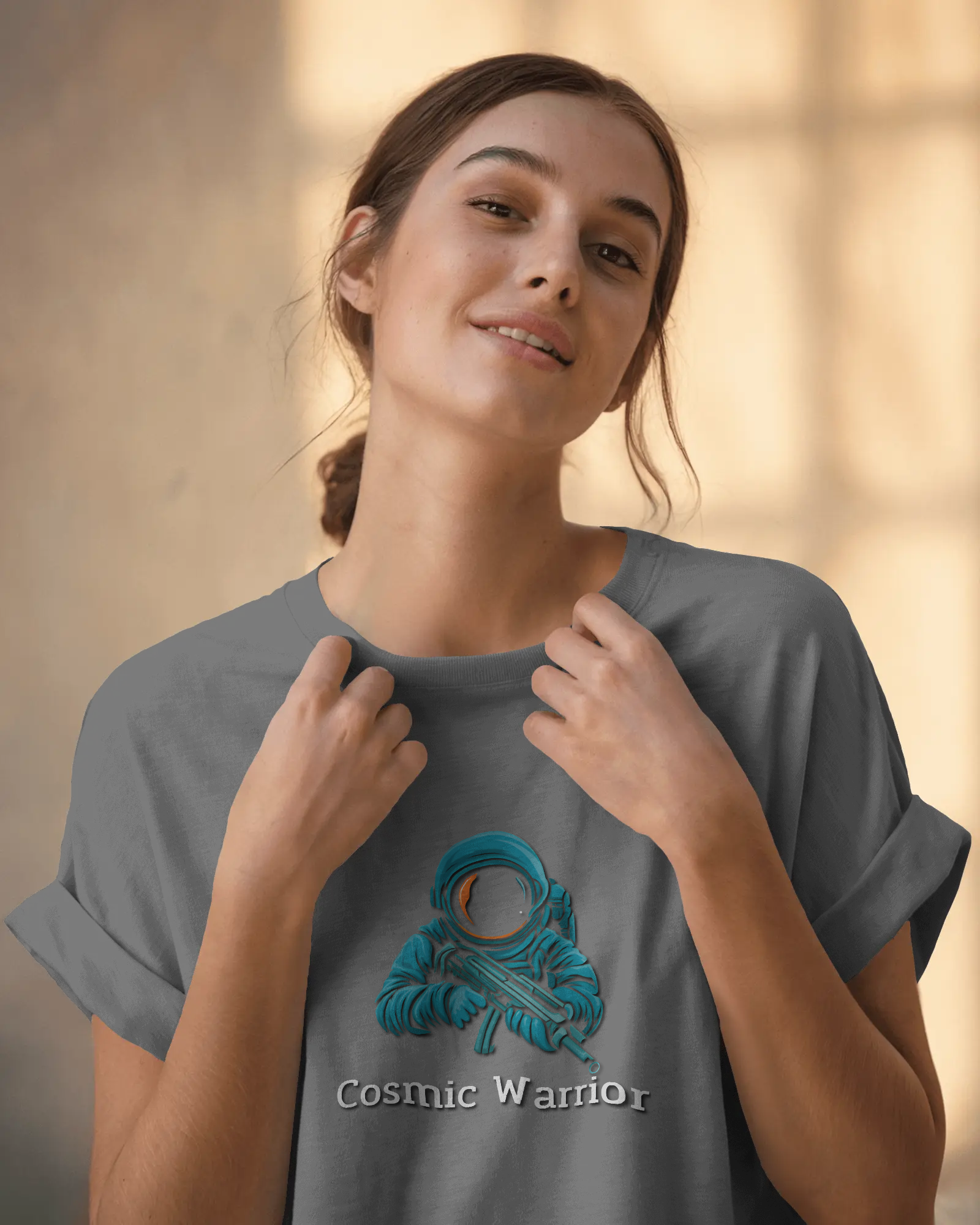The compelling 'Cosmic Warrior' graphic, prominently featured on the chest, showcases a stylized astronaut figure, geared up and ready for an intergalactic quest. This unique design blends futuristic themes with a sense of brave discovery, making it a powerful visual declaration of your adventurous spirit and bold individuality. With its classic regular fit, this tee offers a timeless silhouette that perfectly highlights the commanding graphic.