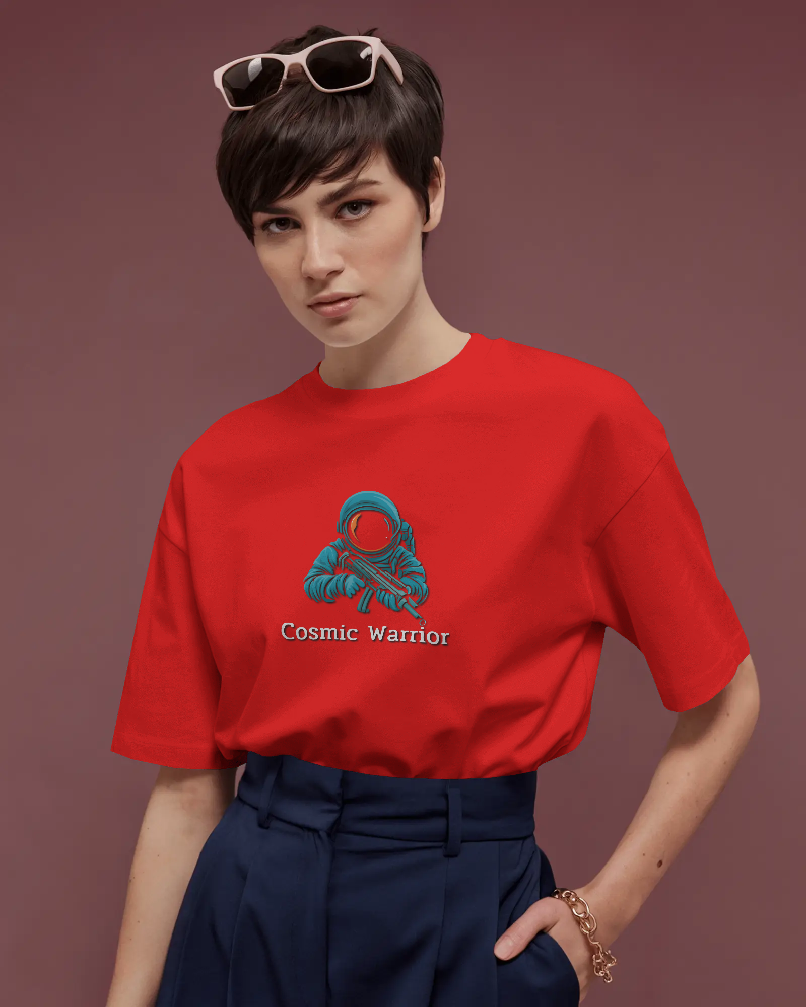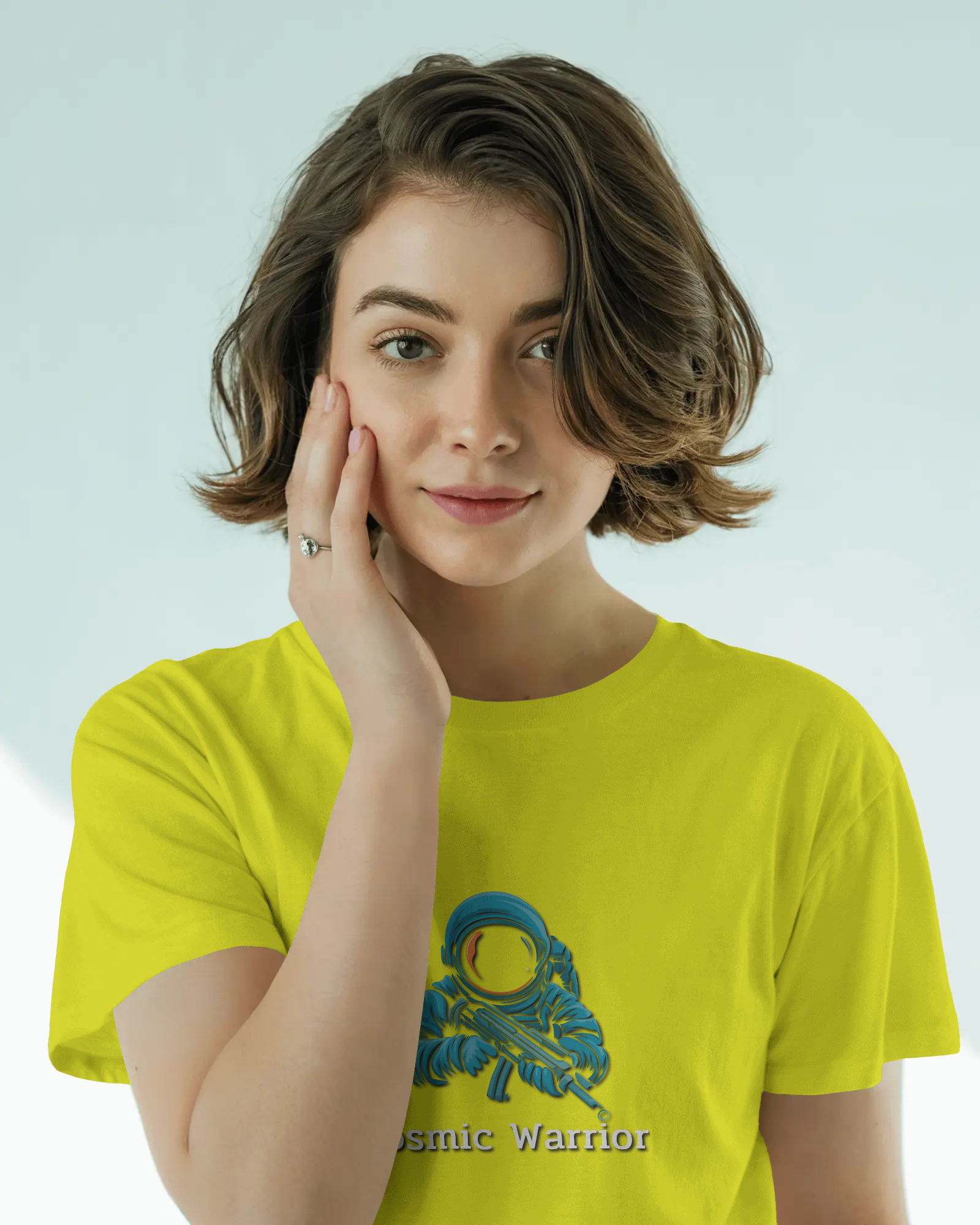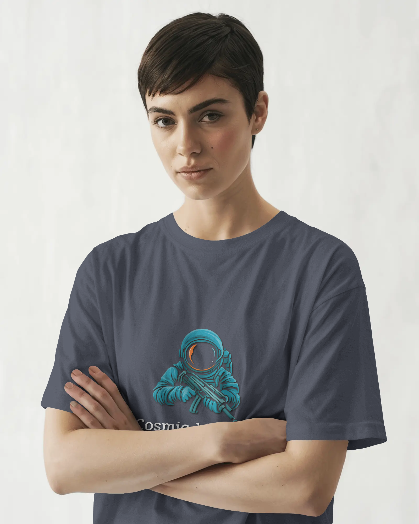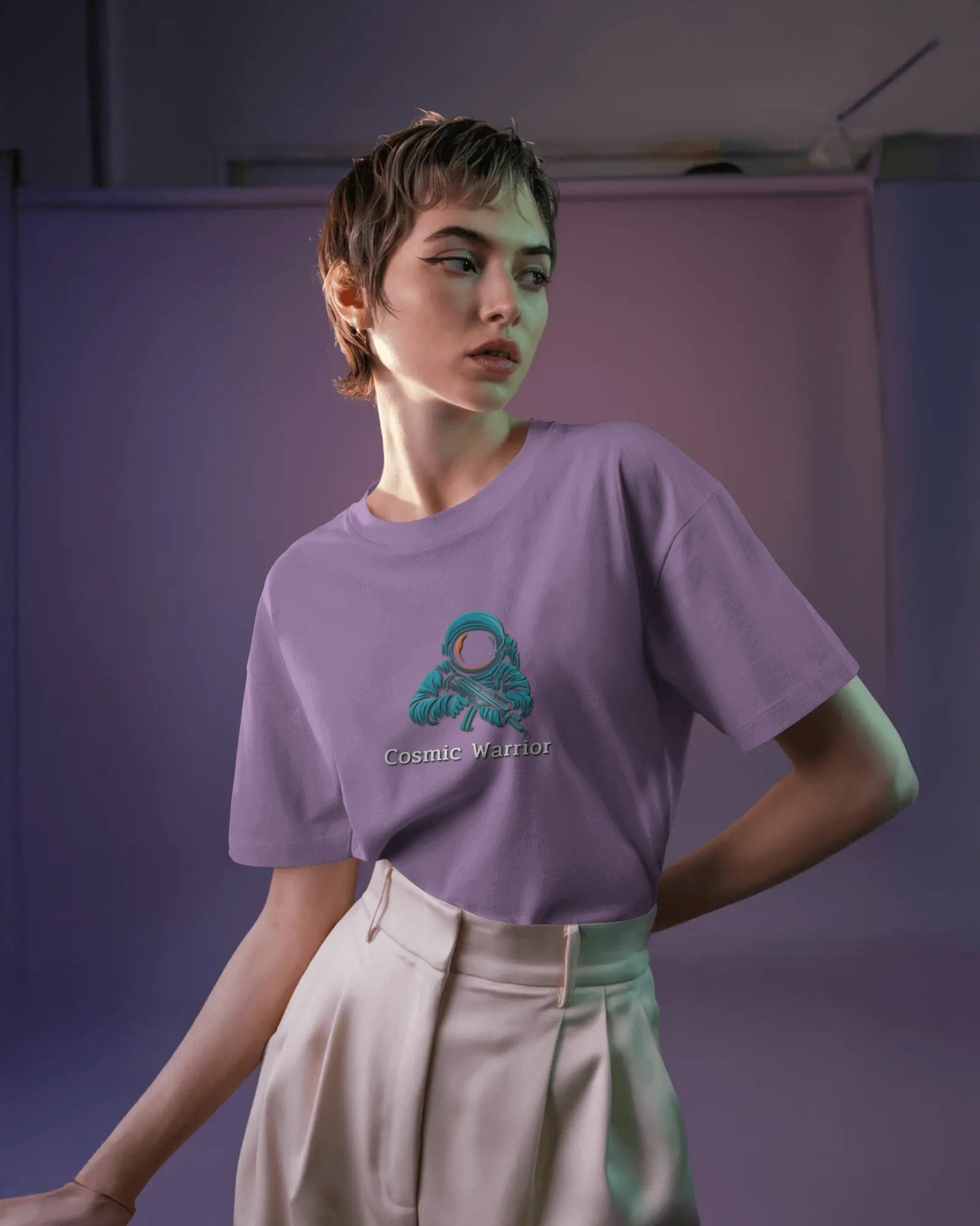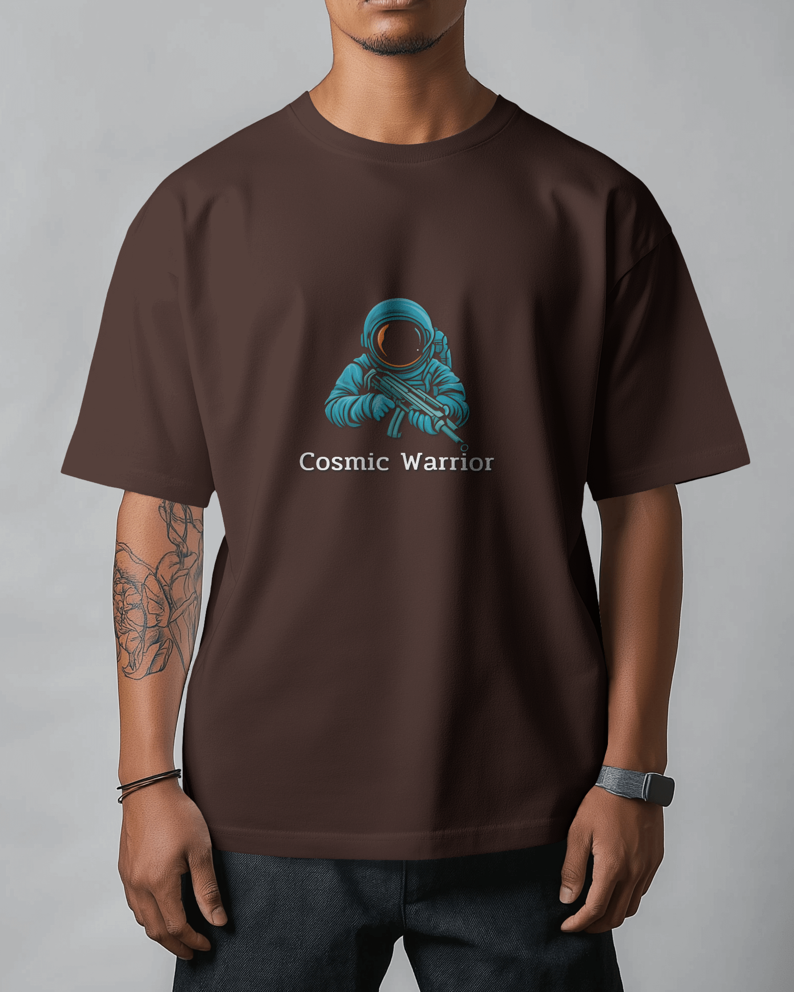 The compelling 'Cosmic Warrior' graphic, prominently featured on the chest, showcases a stylized astronaut figure, geared up and ready for an intergalactic quest. This unique design blends futuristic themes with a sense of brave discovery, making it a powerful visual declaration of your adventurous spirit and bold individuality. With its classic regular fit, this tee offers a timeless silhouette that perfectly highlights the commanding graphic.