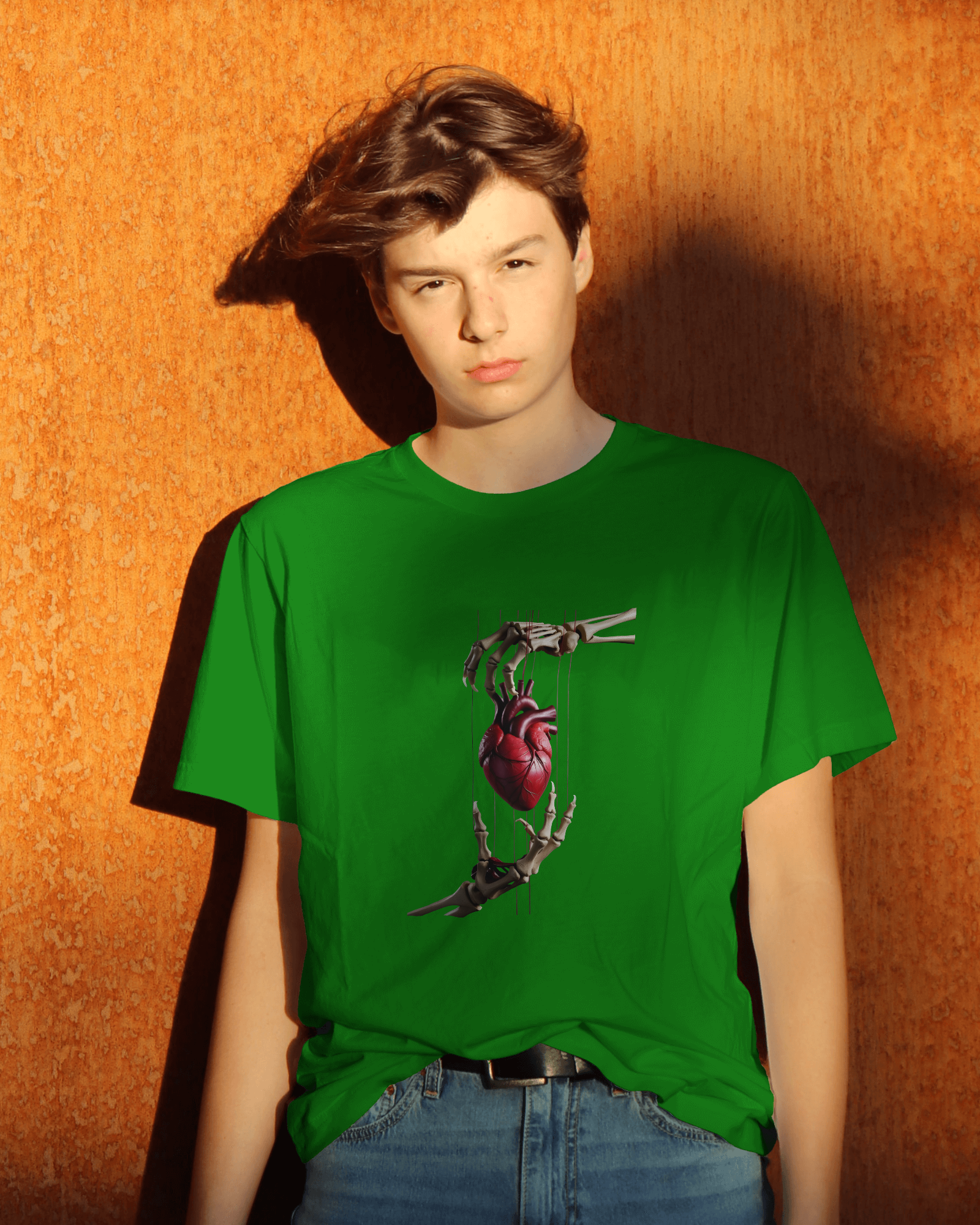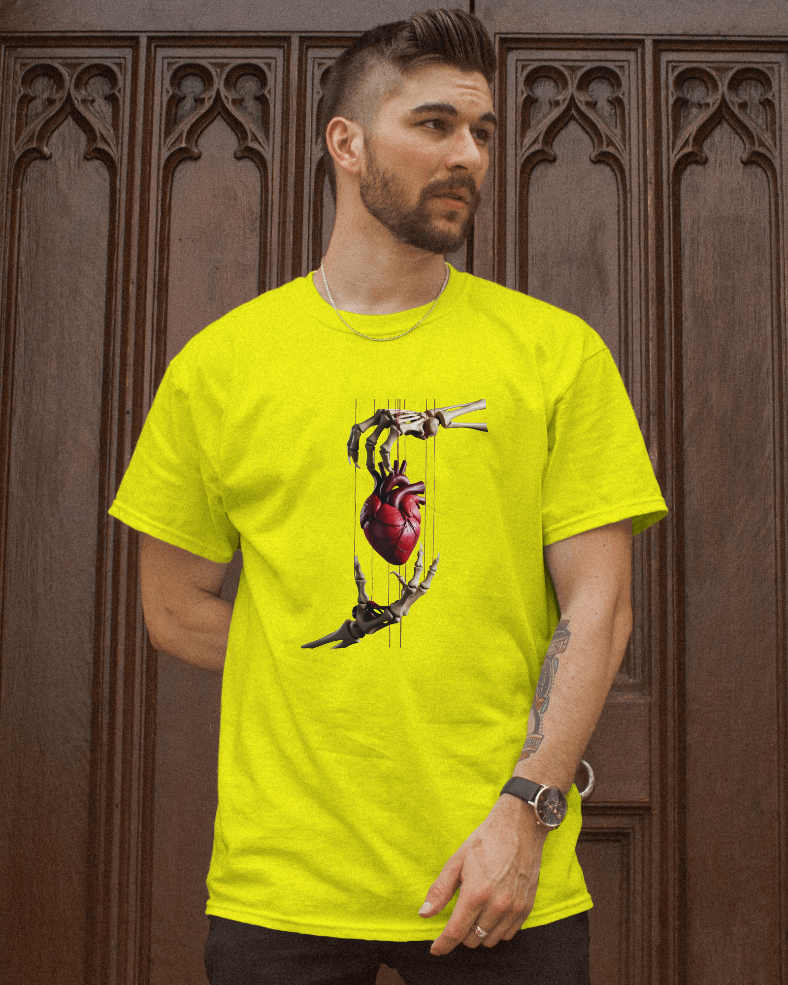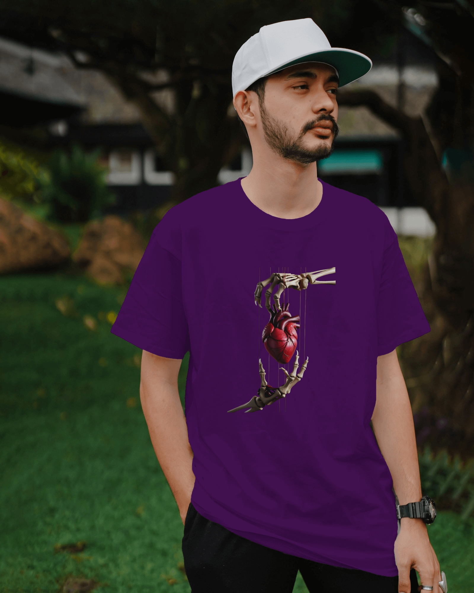 The captivating 'Skeleton Hands Holding Heart' graphic, boldly displayed on the chest, features intricate skeletal hands tenderly cradling a vibrant, anatomical human heart. This powerful image can symbolize eternal love, vulnerability, life's delicate balance, or the raw essence of emotion. This isn't just a design; it’s a statement of your unique perspective and appreciation for art that speaks volumes. With its classic regular fit, this tee offers a timeless silhouette that perfectly highlights the compelling graphic.