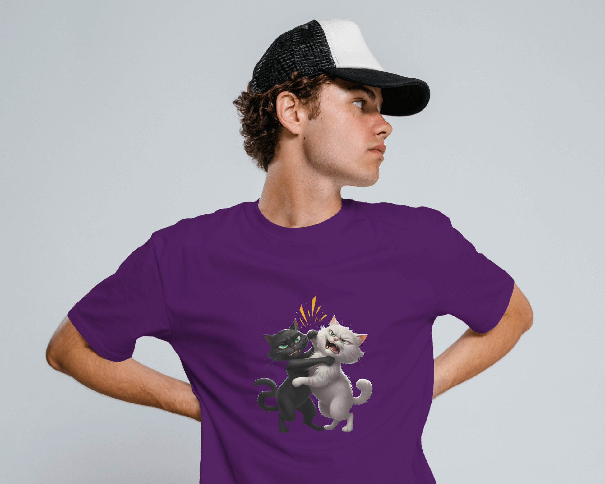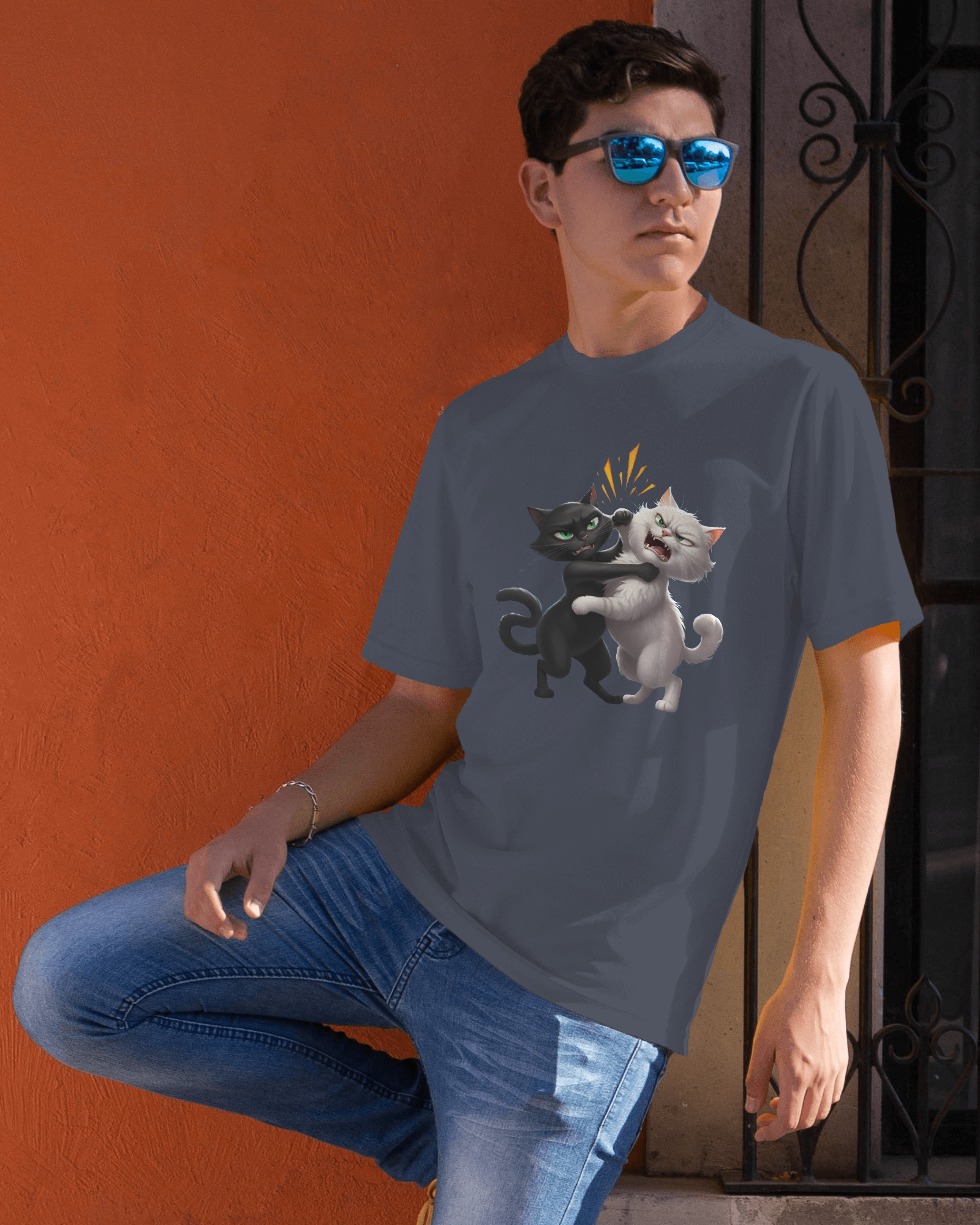 The captivating 'Hugging Cats' graphic, prominently featured on the chest, showcases two adorable, playful cats in a warm embrace – one mischievous black cat and one gleeful gray/white cat. The small 'spark' above their heads hints at their lively bond. This isn't just a design; it's a celebration of friendship, affection, and the endearing personalities of our feline companions. With its classic regular fit, this tee offers a timeless silhouette that perfectly highlights the delightful graphic.