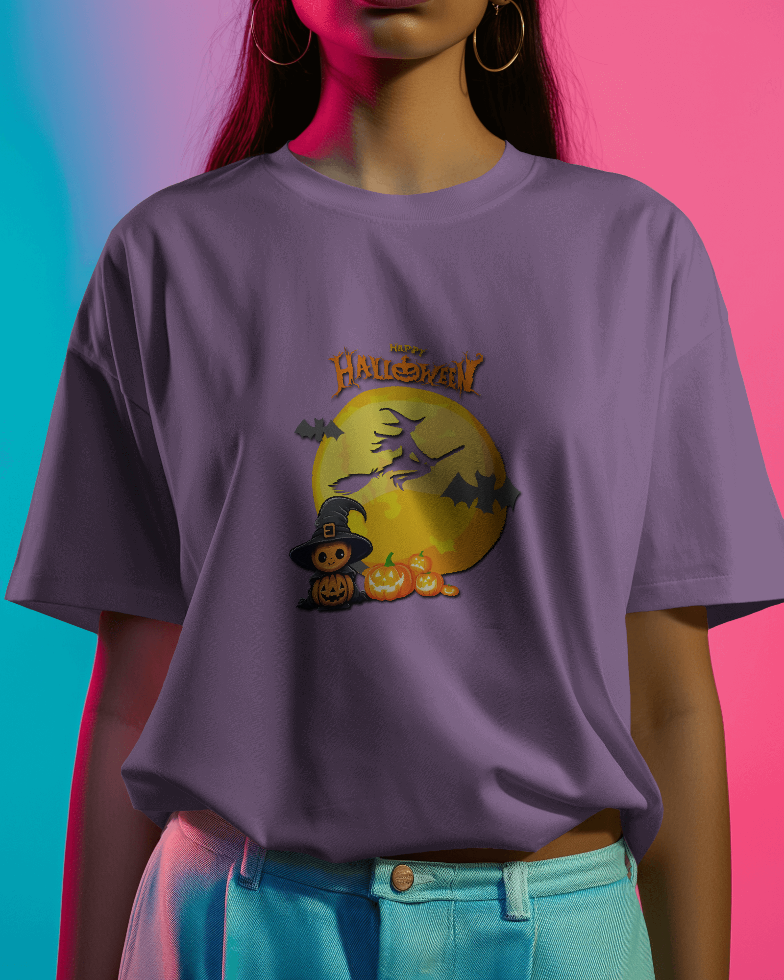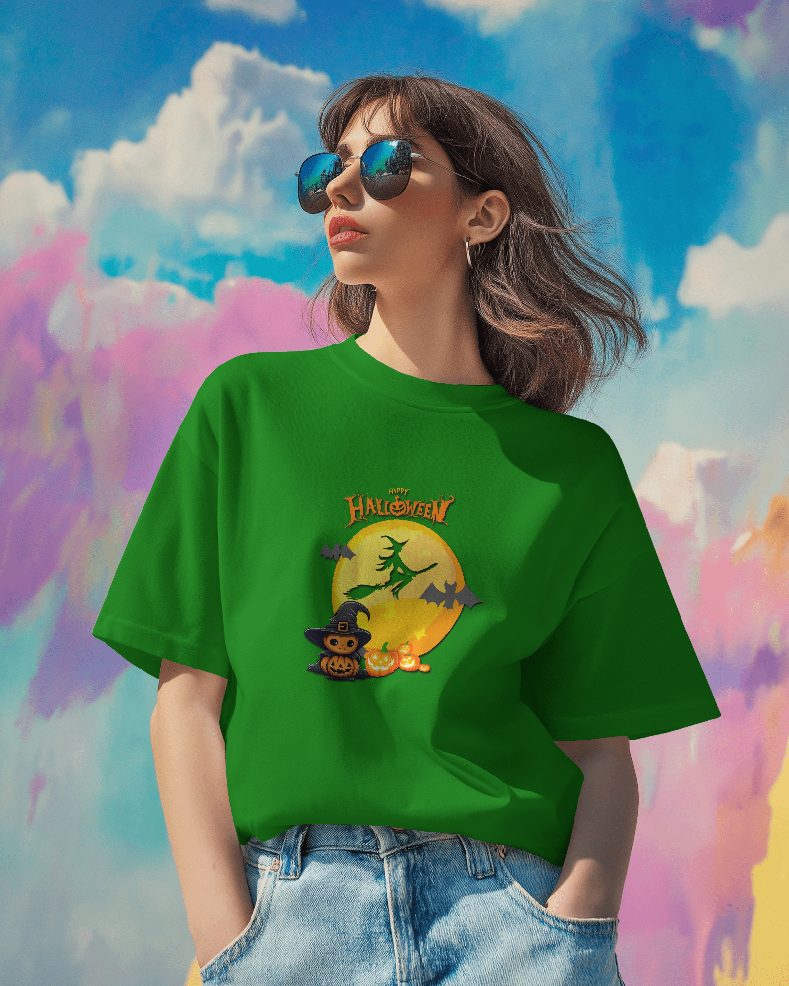 ✅ Spooky Yet Playful Design – A witch soaring across a glowing full moon, with mischievous carved pumpkins and a curious black cat watching below! 🌙🧙♀️