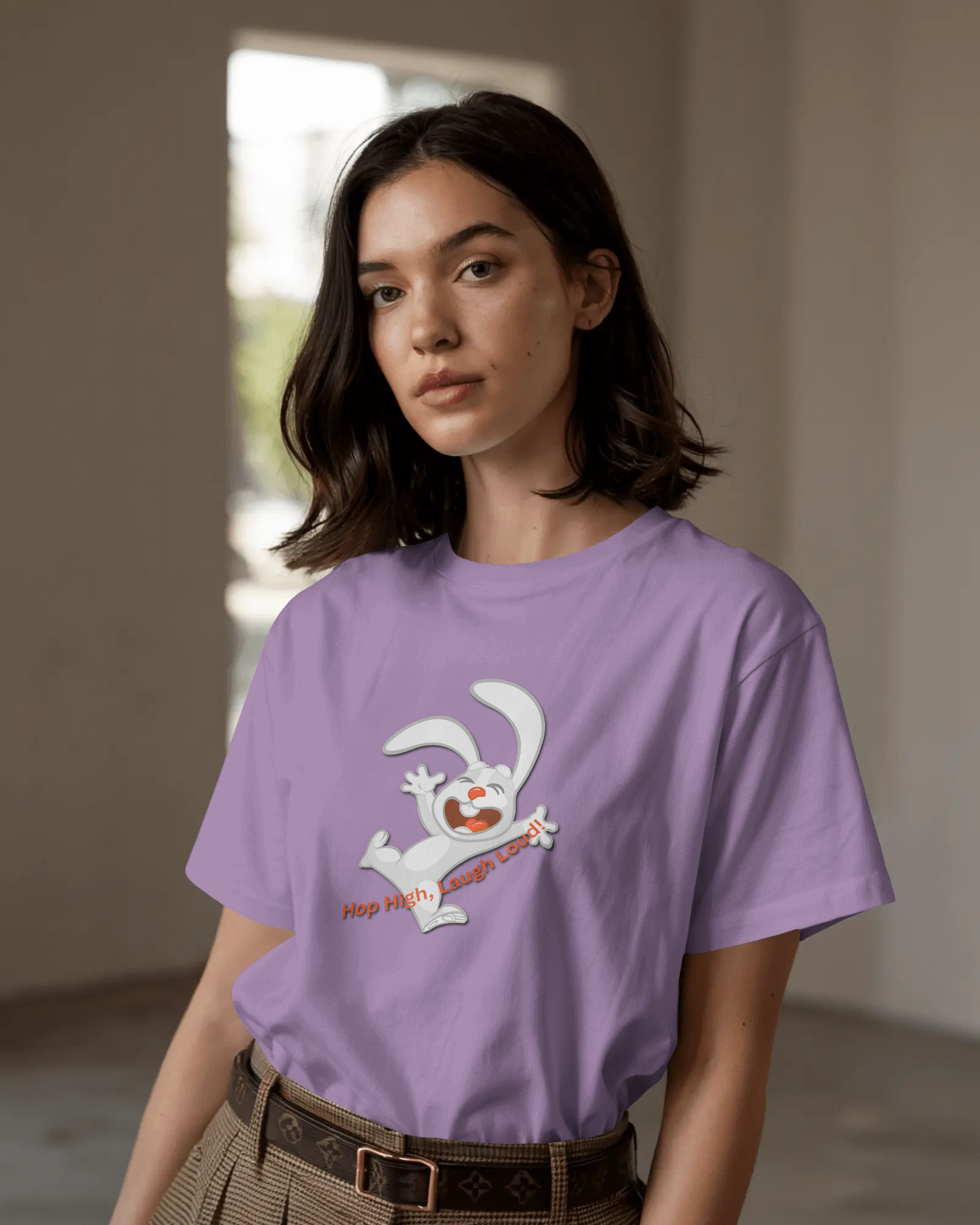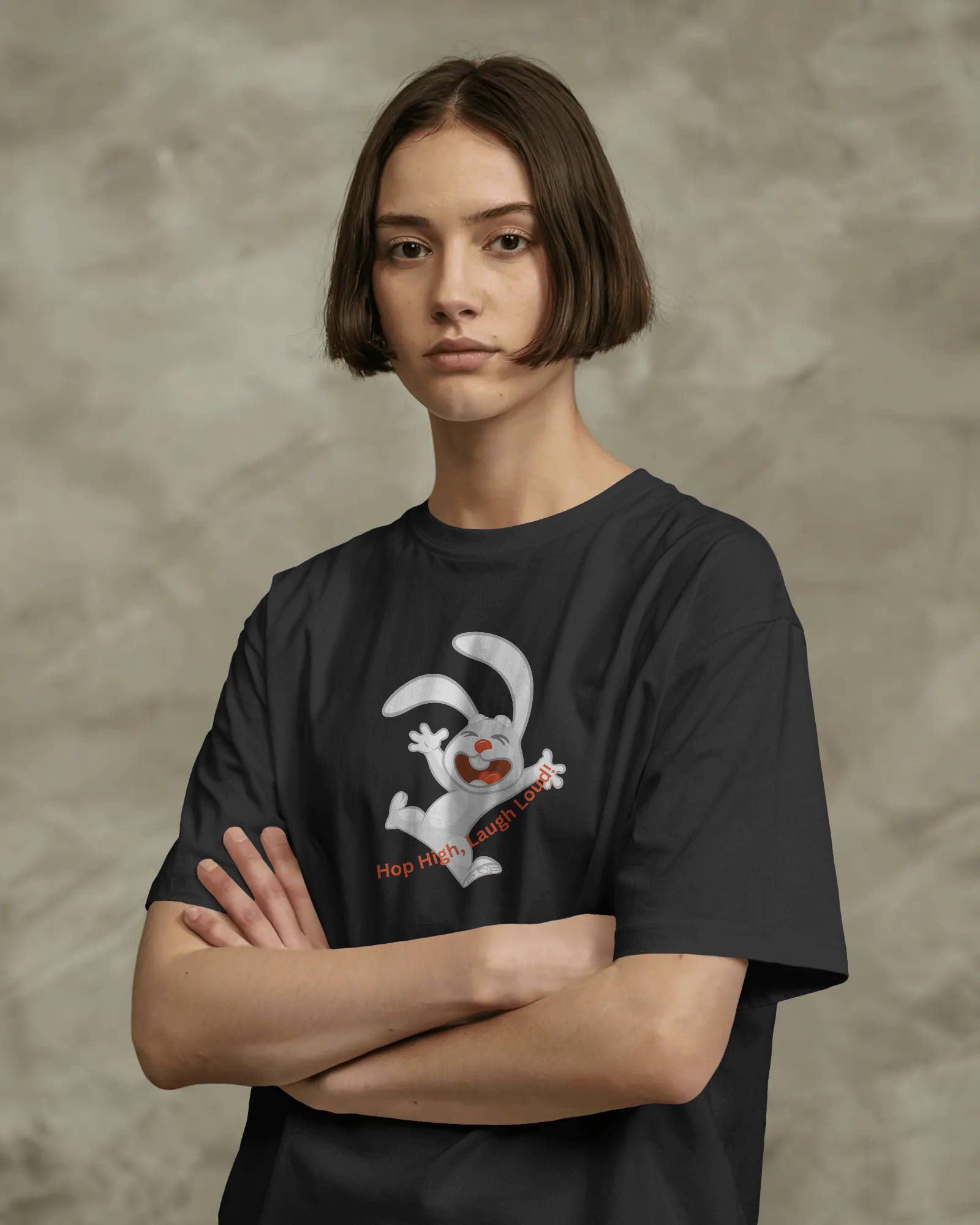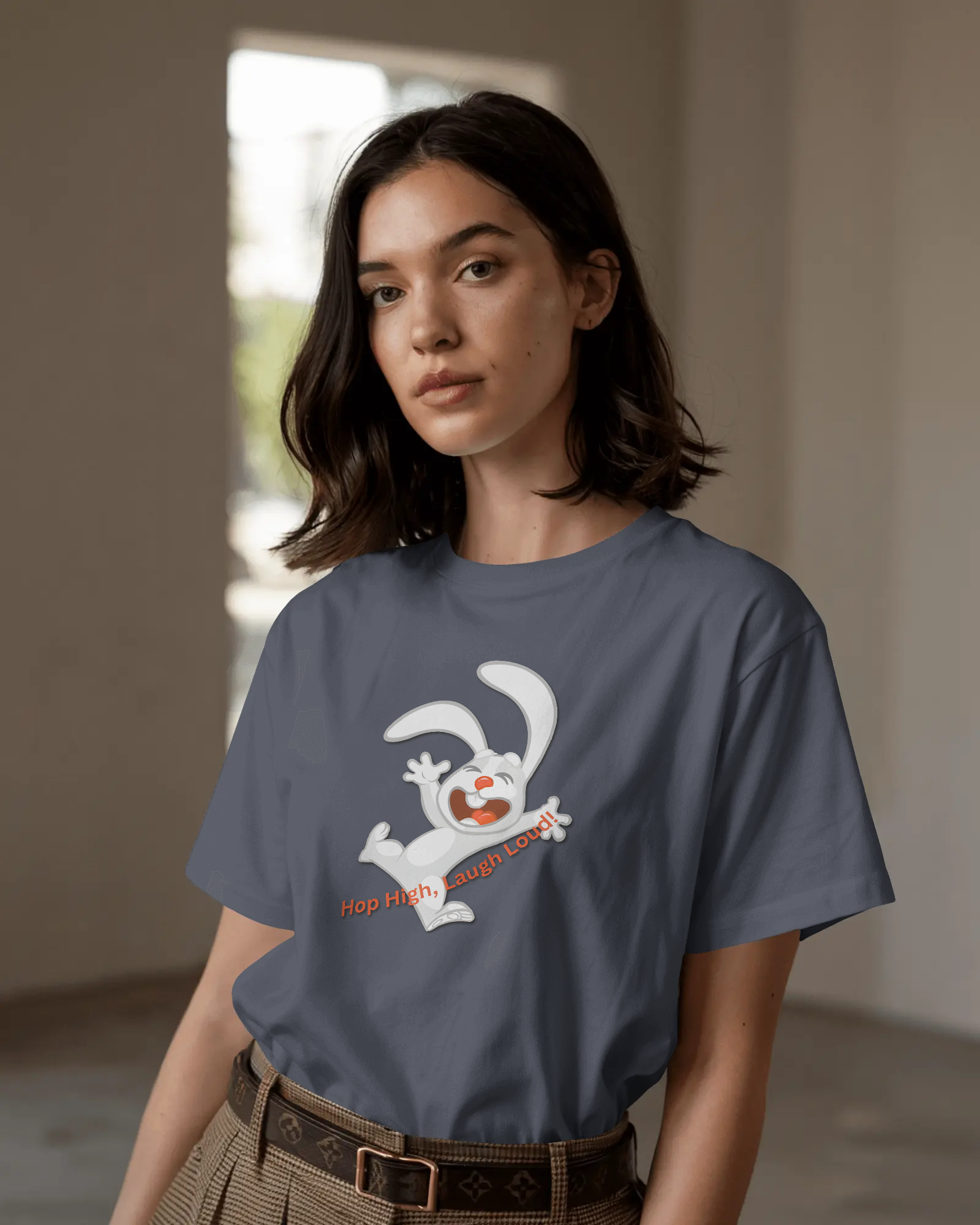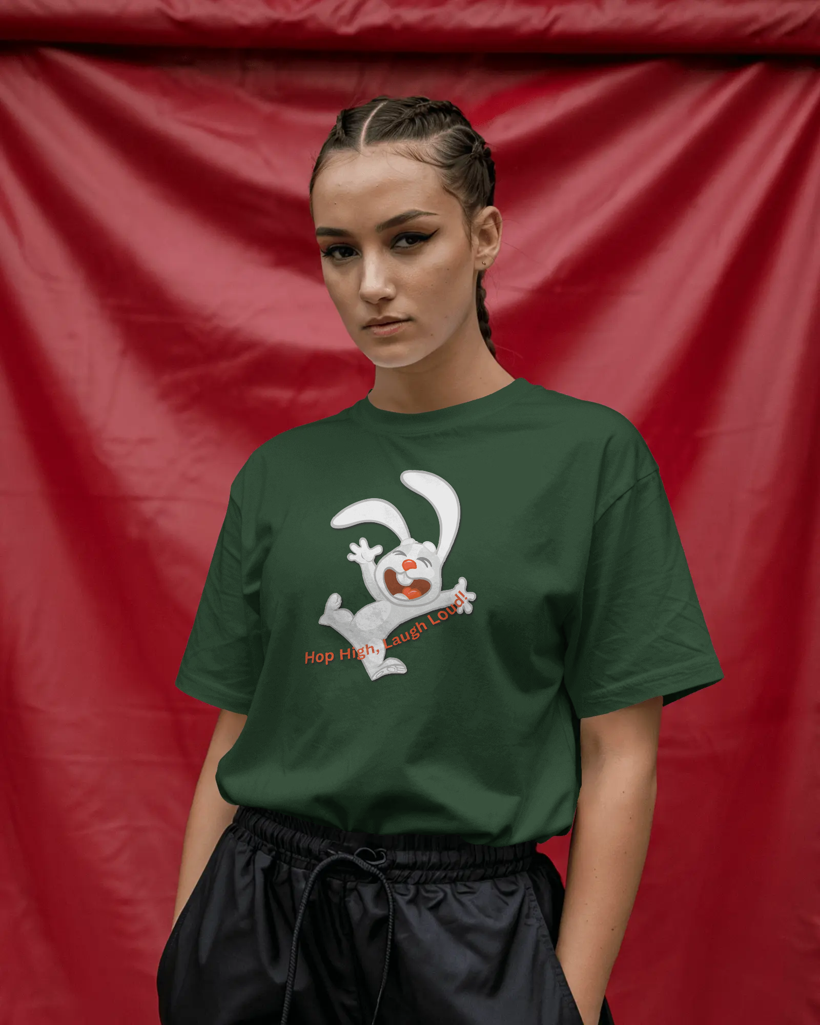 - Energetic 'Hop High!' Rabbit Graphic: A unique and cheerful design that brings a burst of positivity and fun to your outfit.