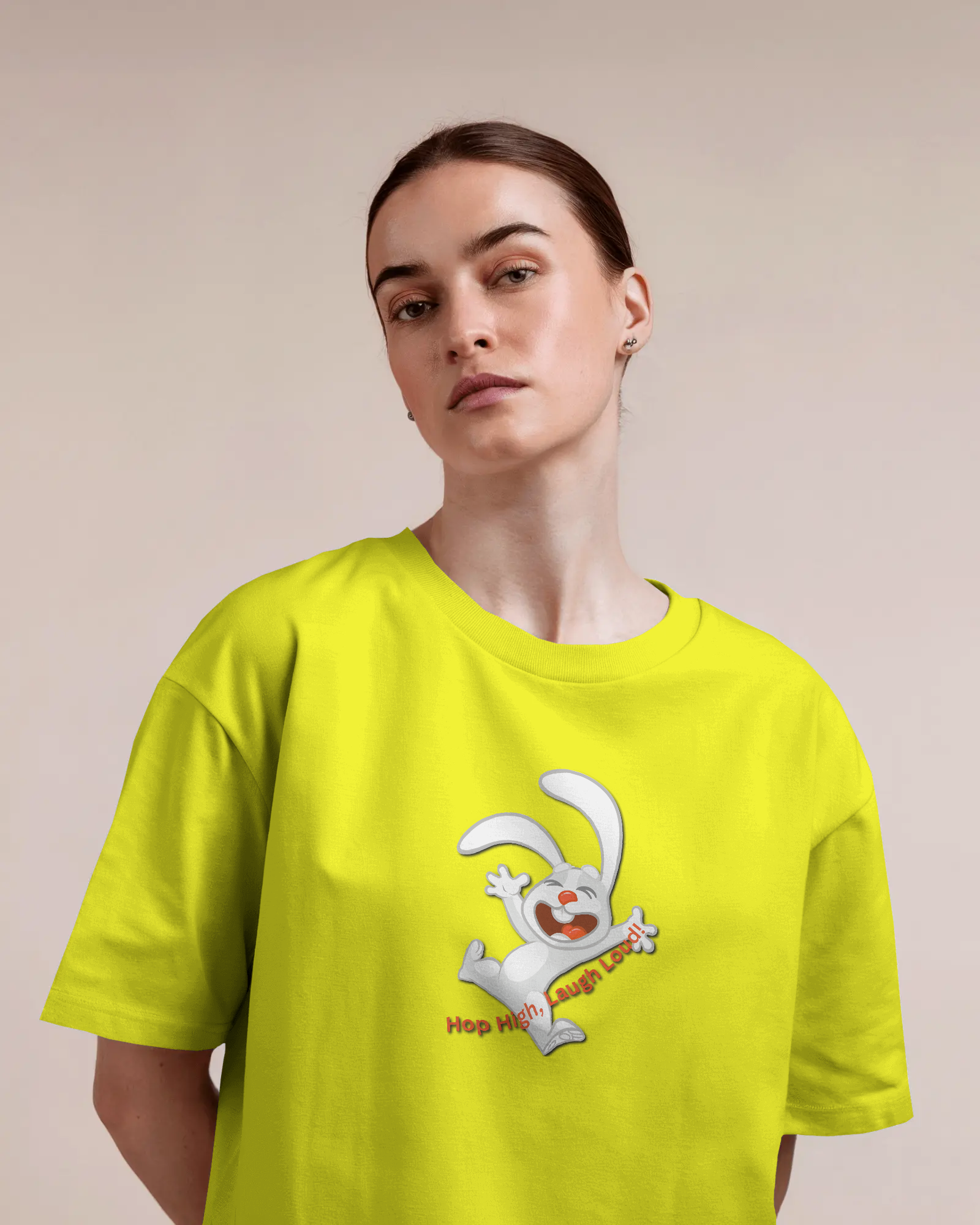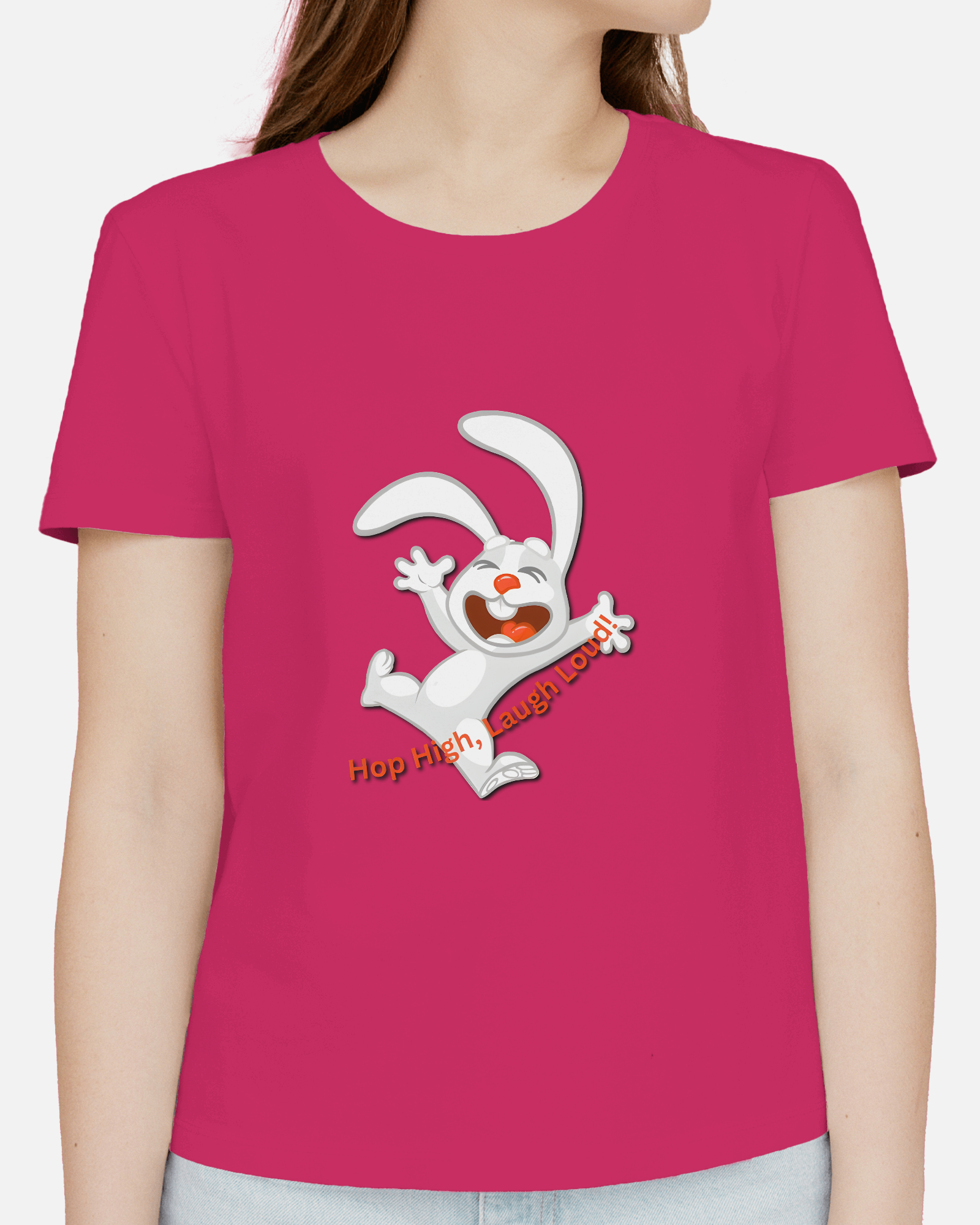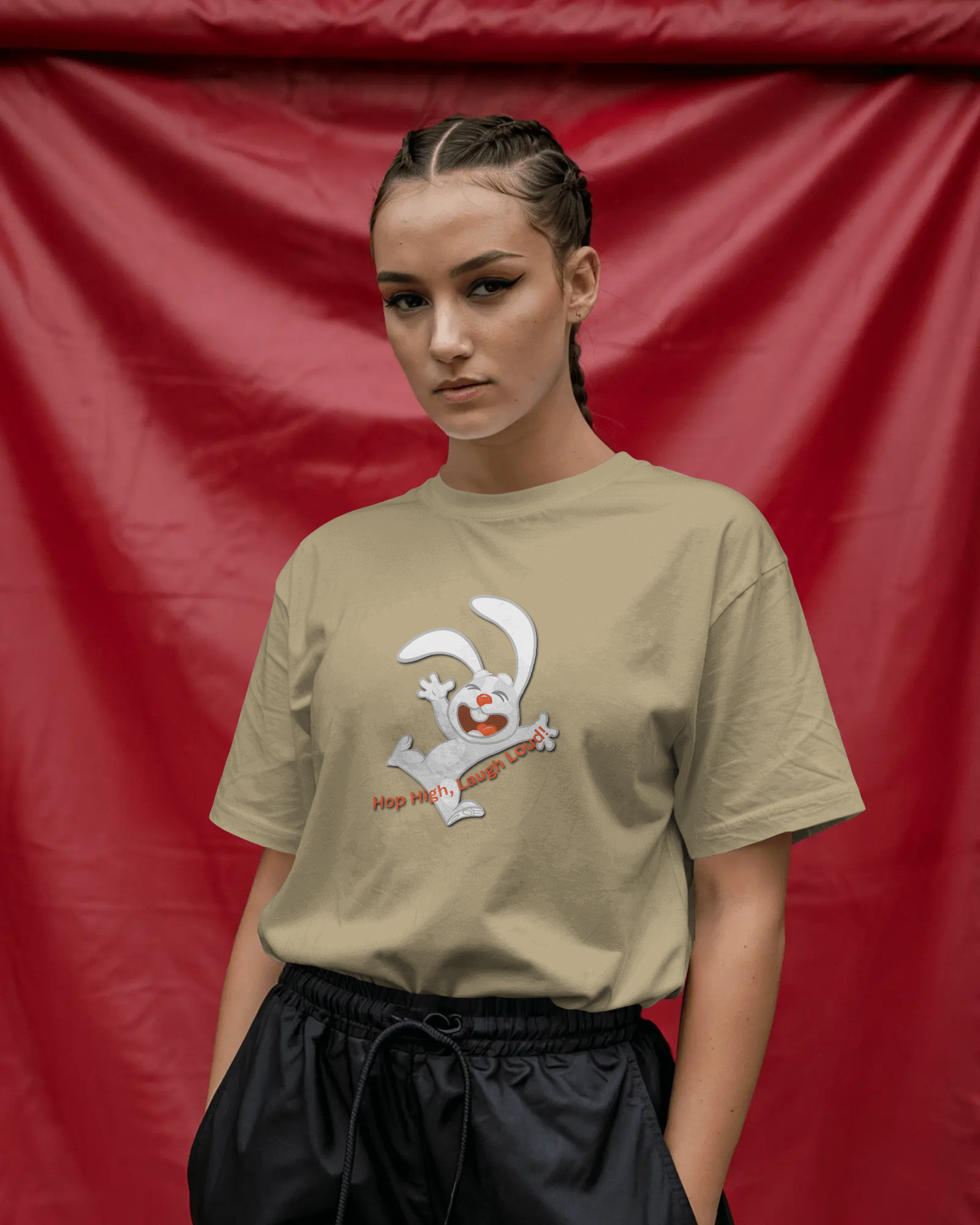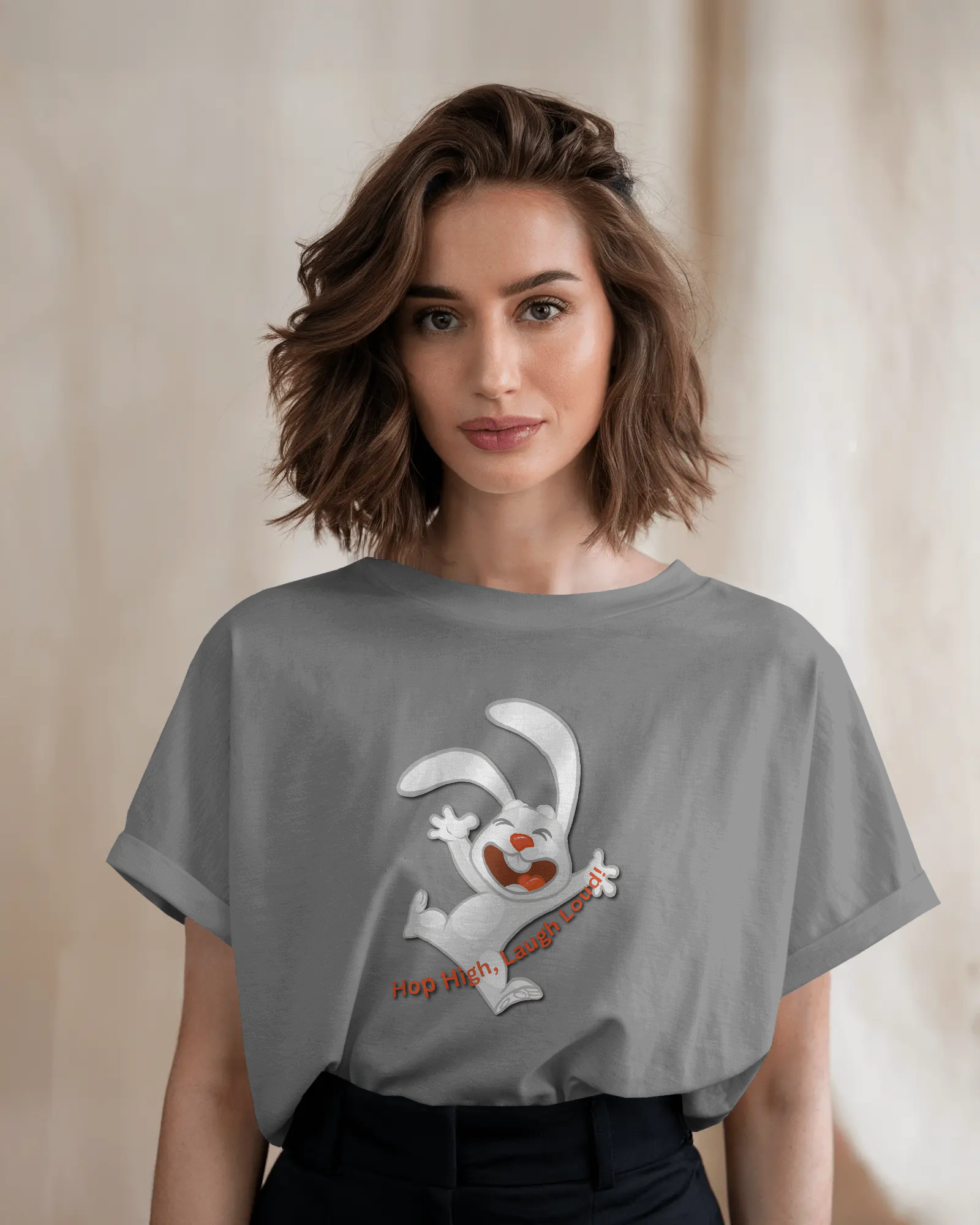 - Energetic 'Hop High!' Rabbit Graphic: A unique and cheerful design that brings a burst of positivity and fun to your outfit.