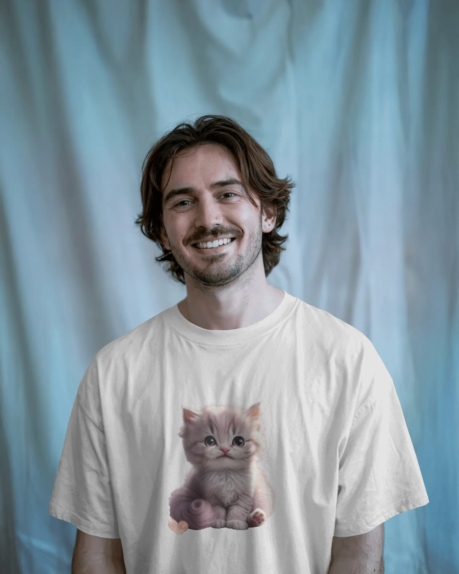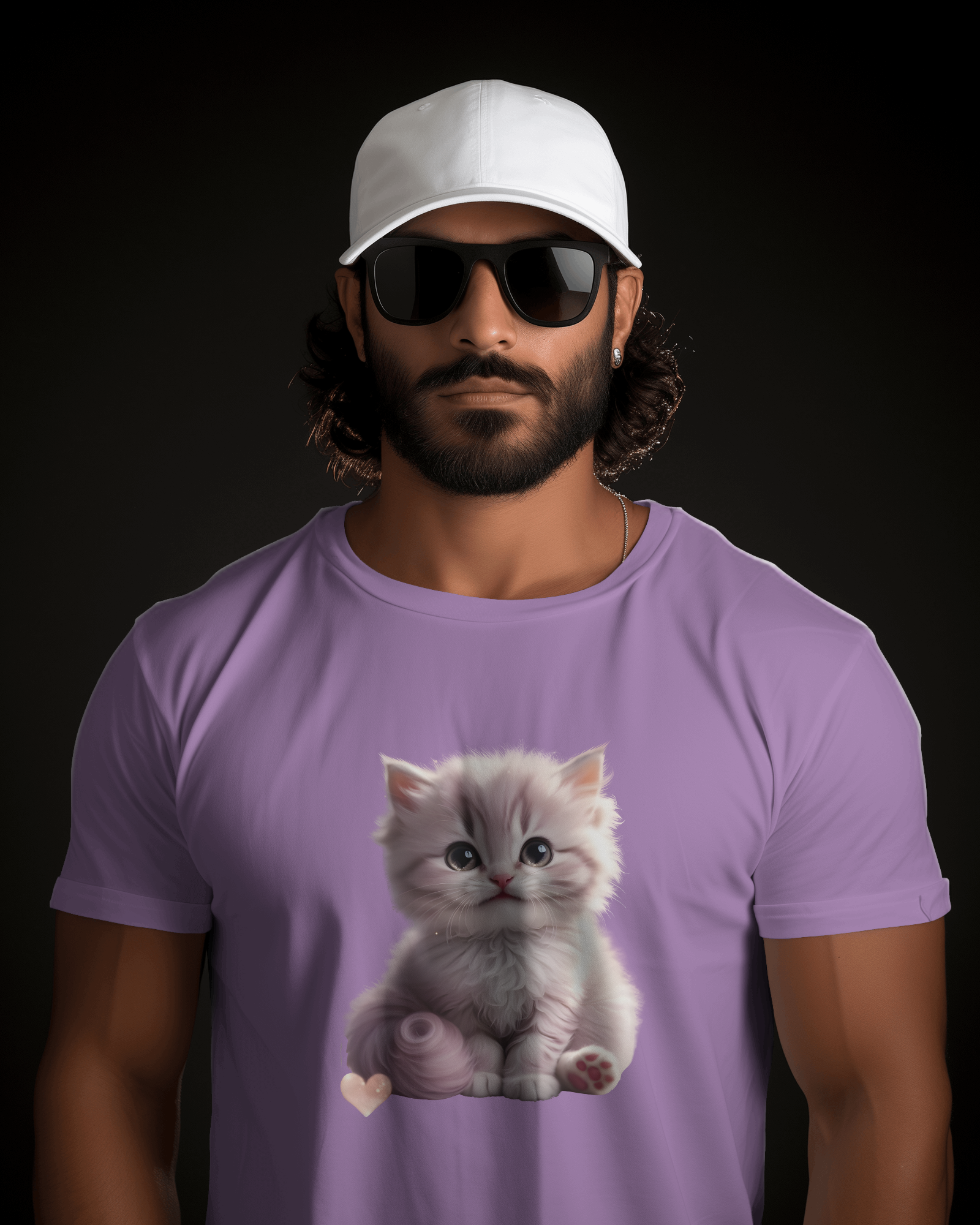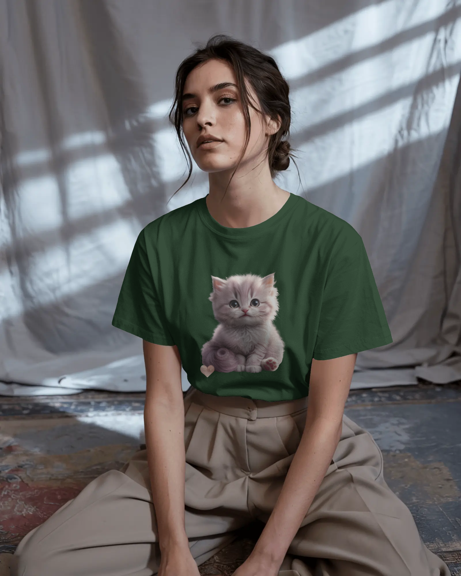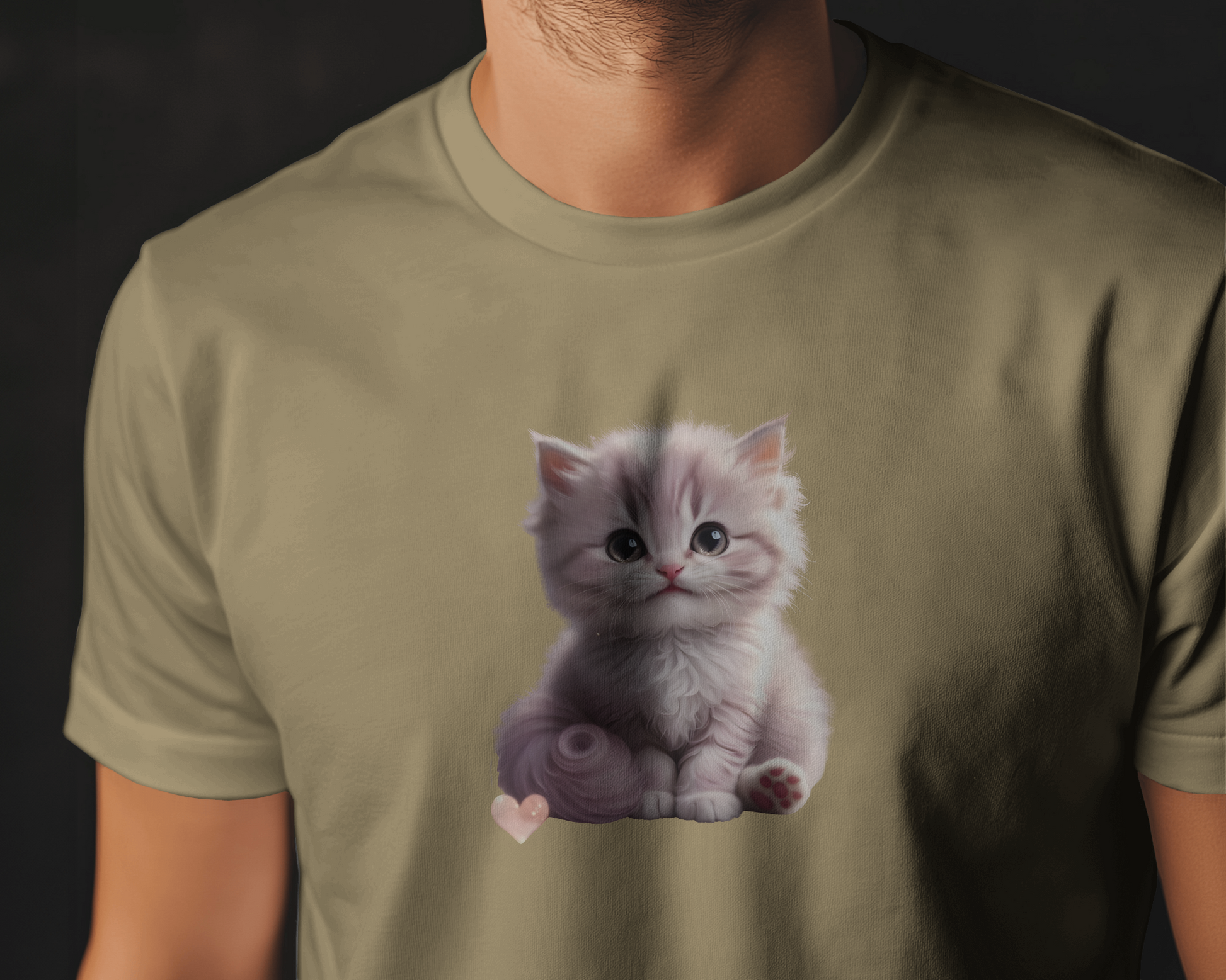 The captivating 'Cute Kitten' graphic, prominently featured on the chest, showcases an irresistibly fluffy, wide-eyed kitten, complete with a tiny pink heart – an emblem of pure affection. This isn't just a design; it's a mood-lifter, a charming nod to the joy and warmth that pets bring into our lives. With its classic regular fit, this tee offers a timeless silhouette that perfectly highlights the endearing graphic.