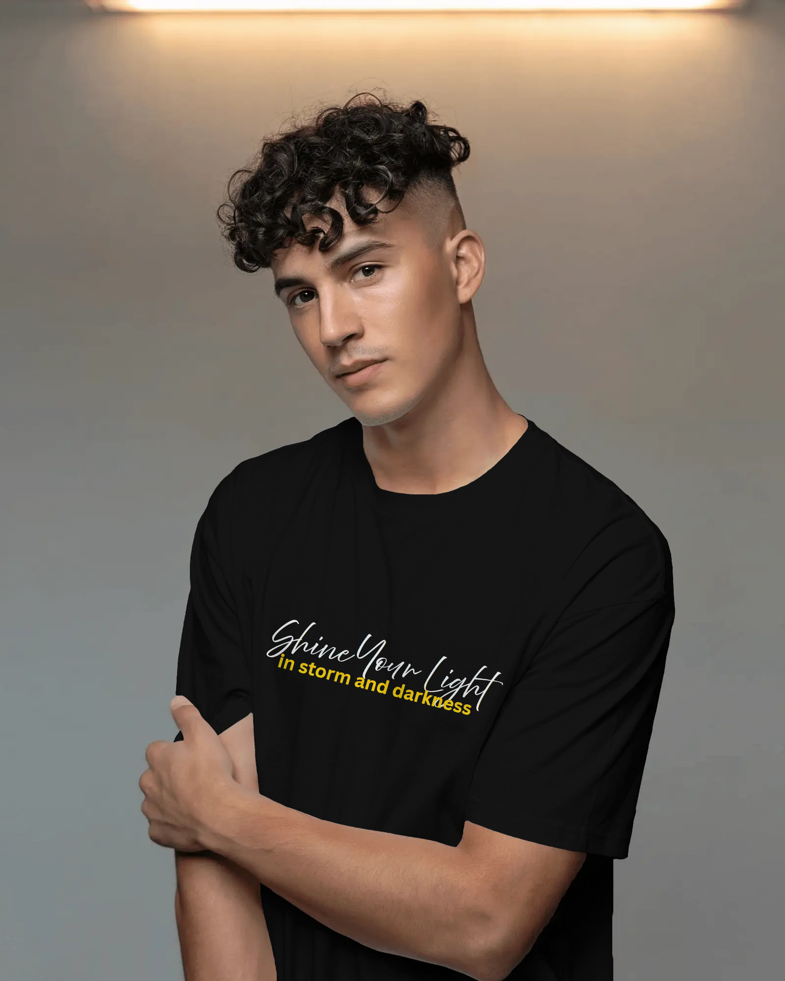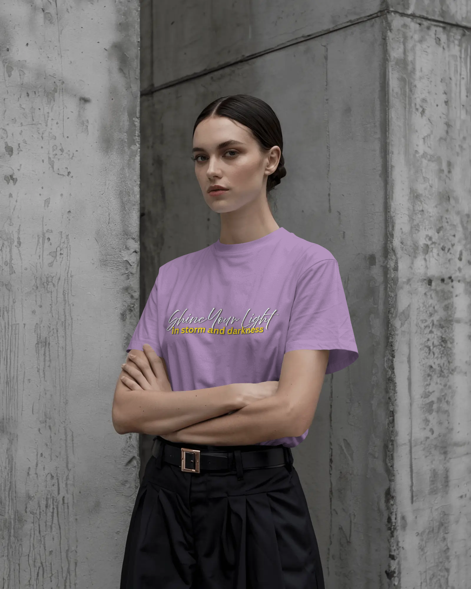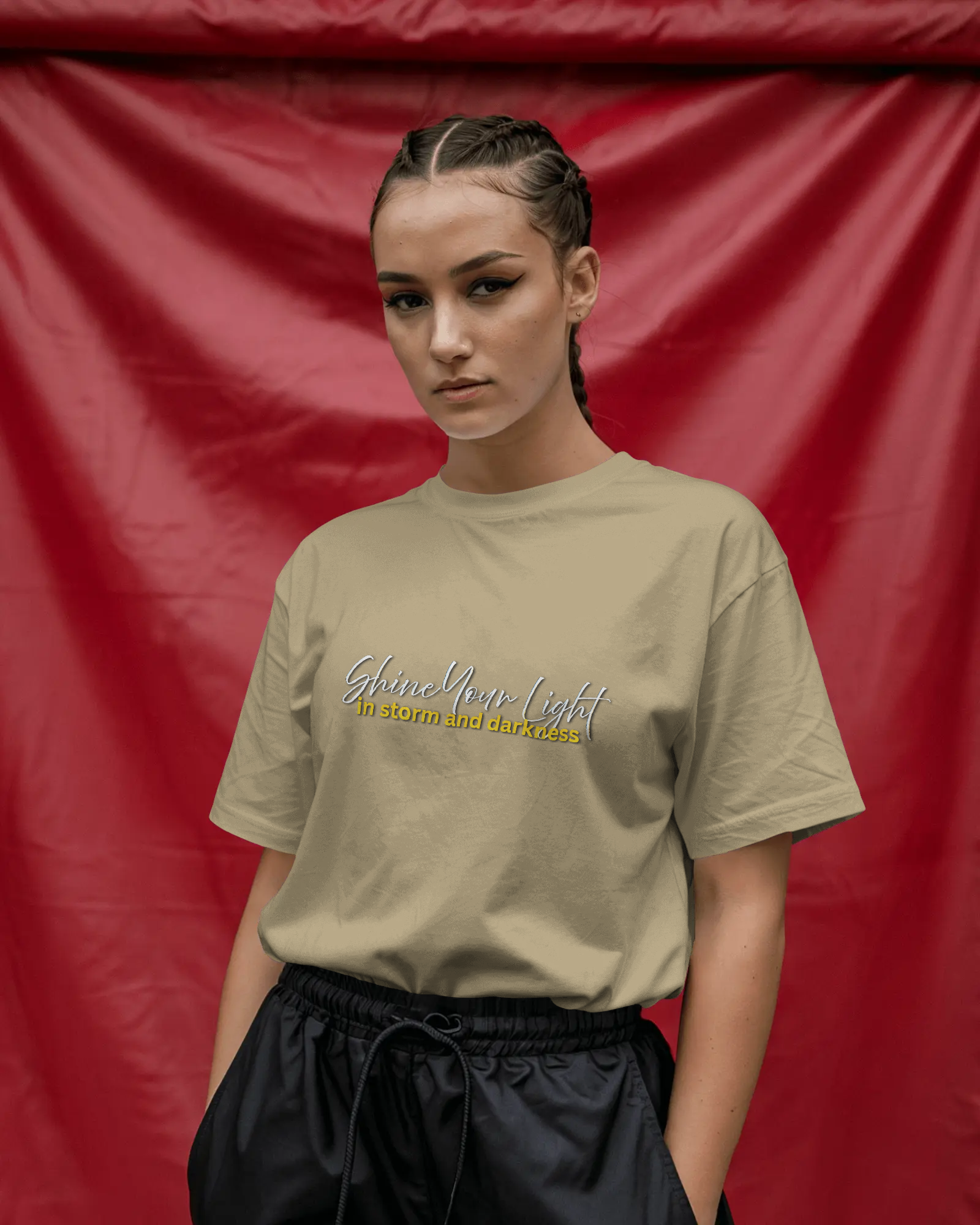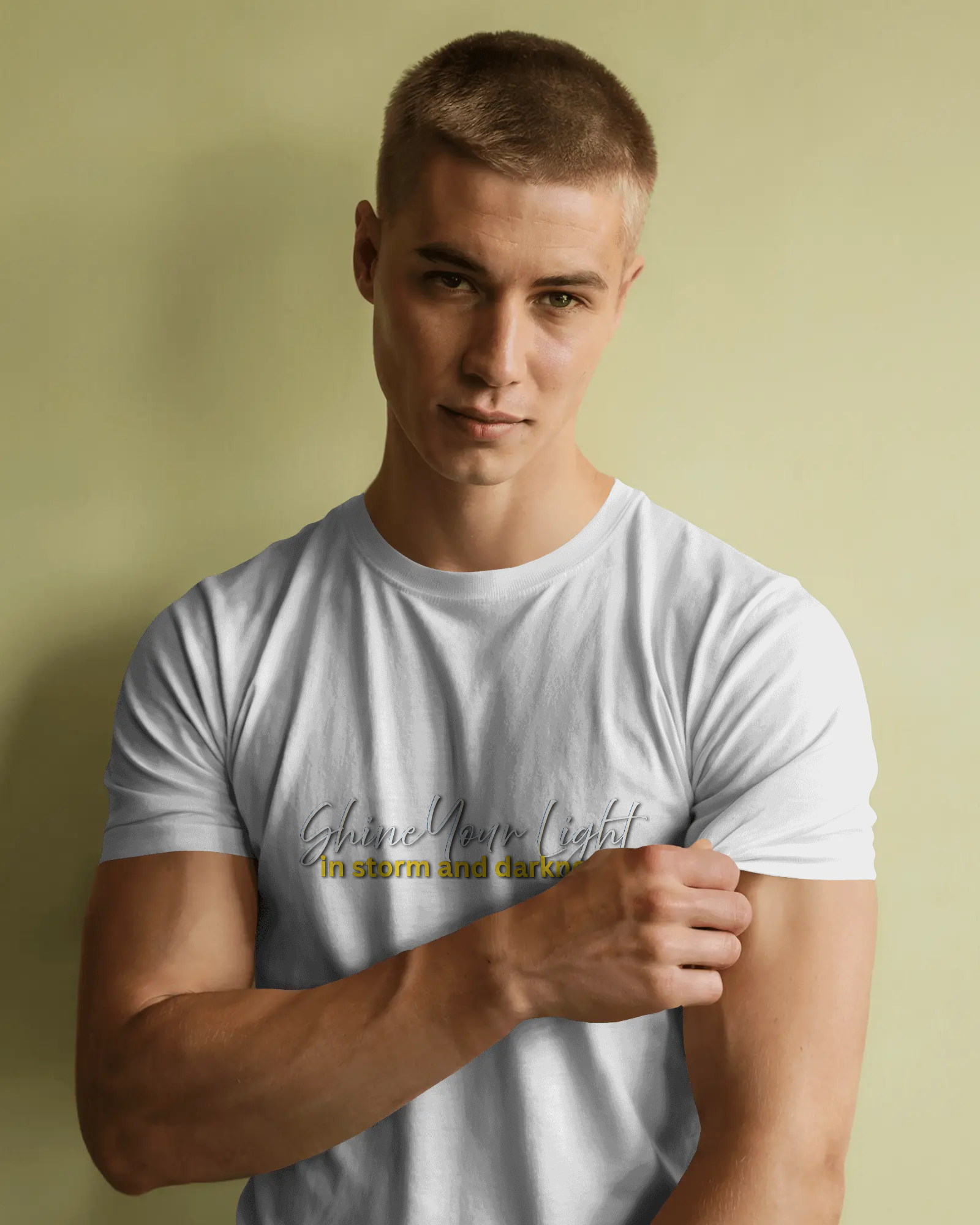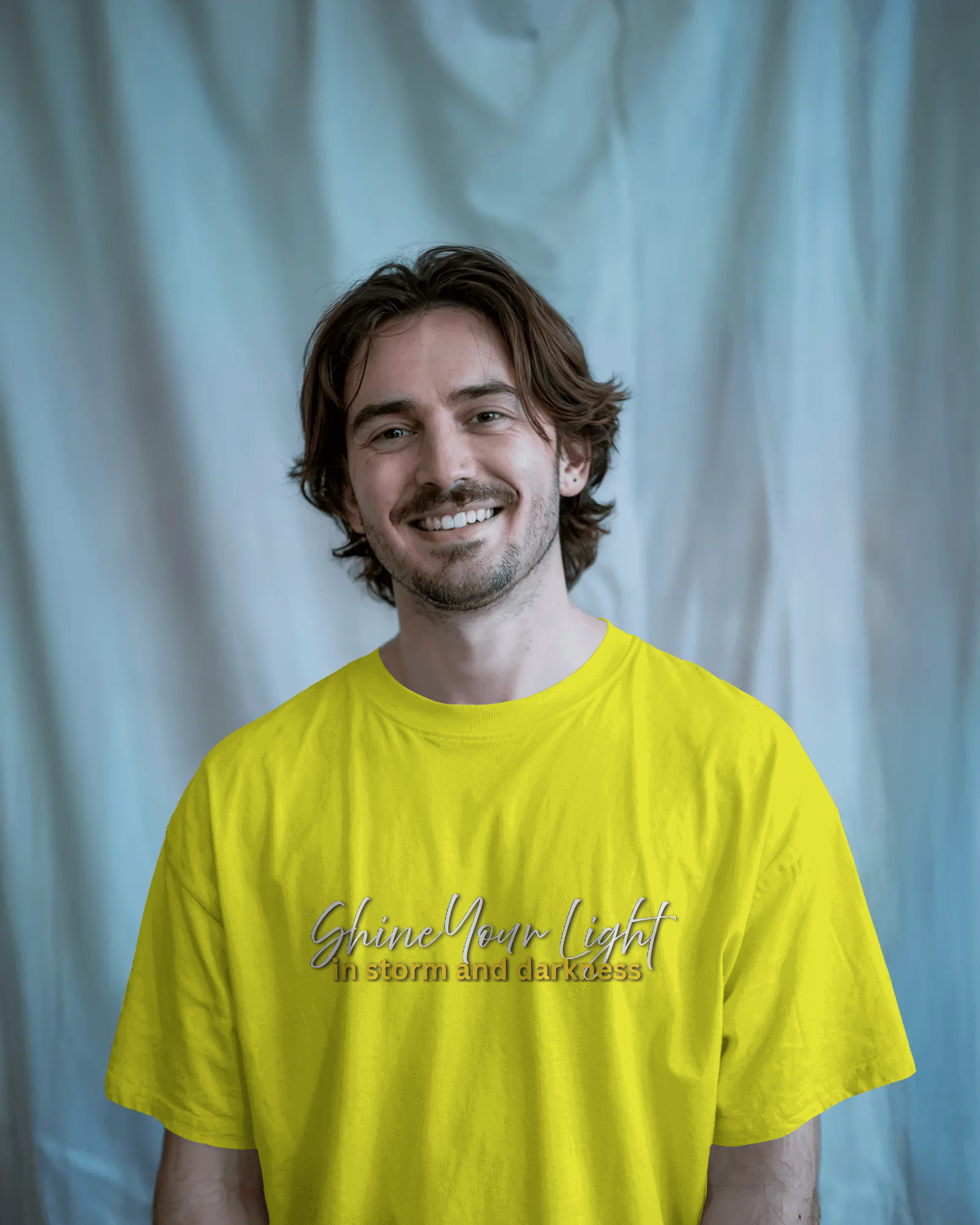 The compelling 'Shine Your Light in storm and darkness' graphic, prominently featured on the chest, showcases elegant, flowing typography that emphasizes its profound and uplifting message. This unique design blends artistic text with a universal theme of hope and resilience, making it a powerful visual declaration of your optimistic spirit and inner radiance. With its classic regular fit, this tee offers a timeless silhouette that perfectly highlights the inspiring graphic.