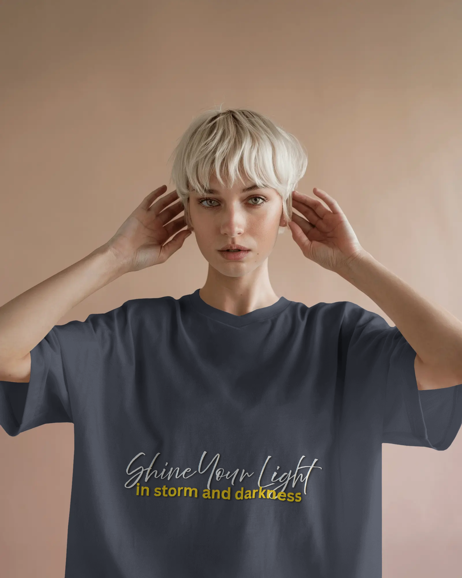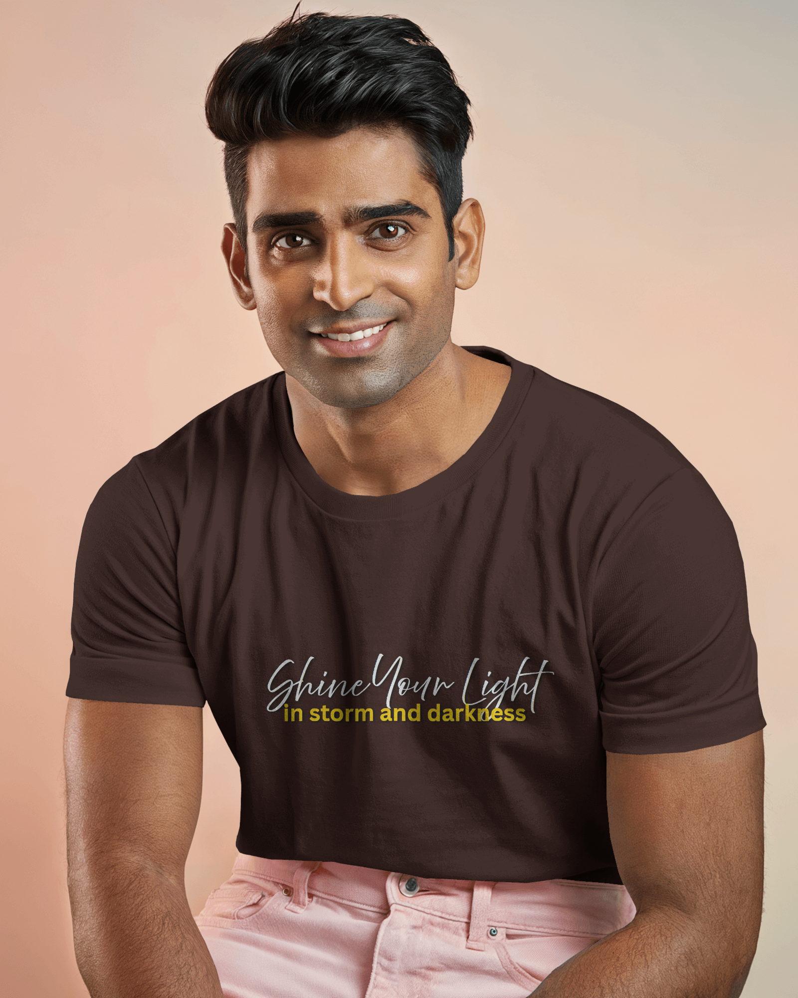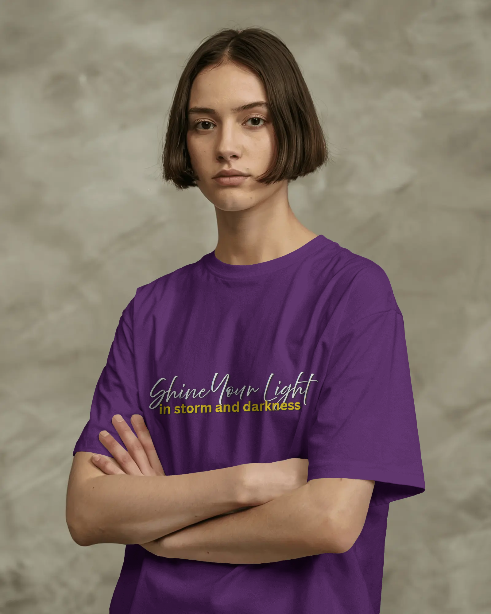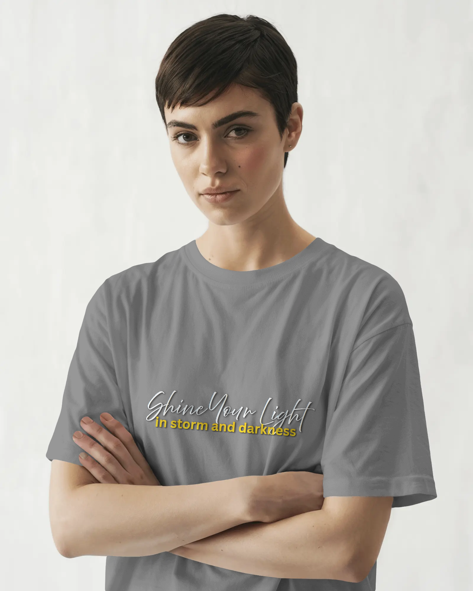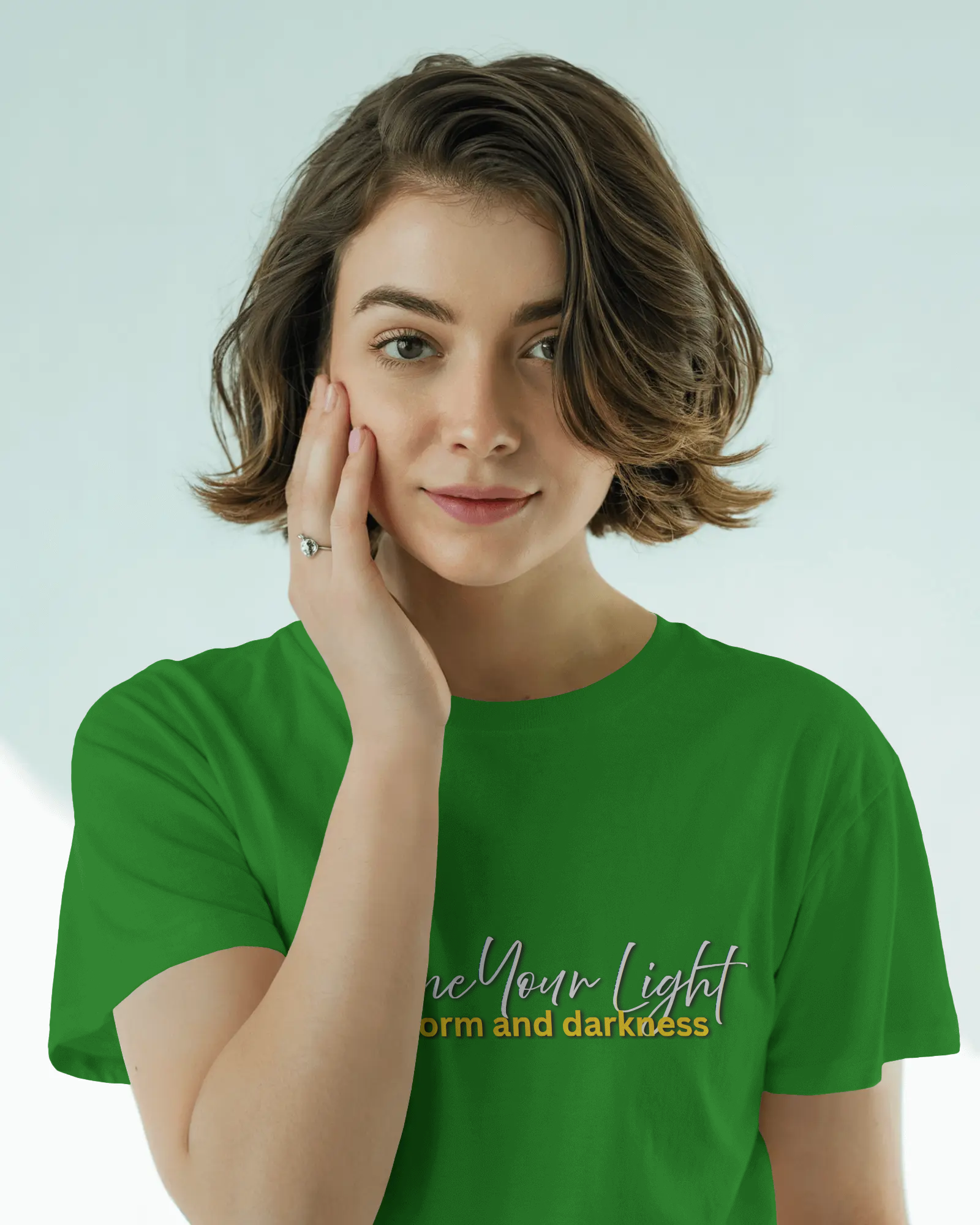 The compelling 'Shine Your Light in storm and darkness' graphic, prominently featured on the chest, showcases elegant, flowing typography that emphasizes its profound and uplifting message. This unique design blends artistic text with a universal theme of hope and resilience, making it a powerful visual declaration of your optimistic spirit and inner radiance. With its classic regular fit, this tee offers a timeless silhouette that perfectly highlights the inspiring graphic.