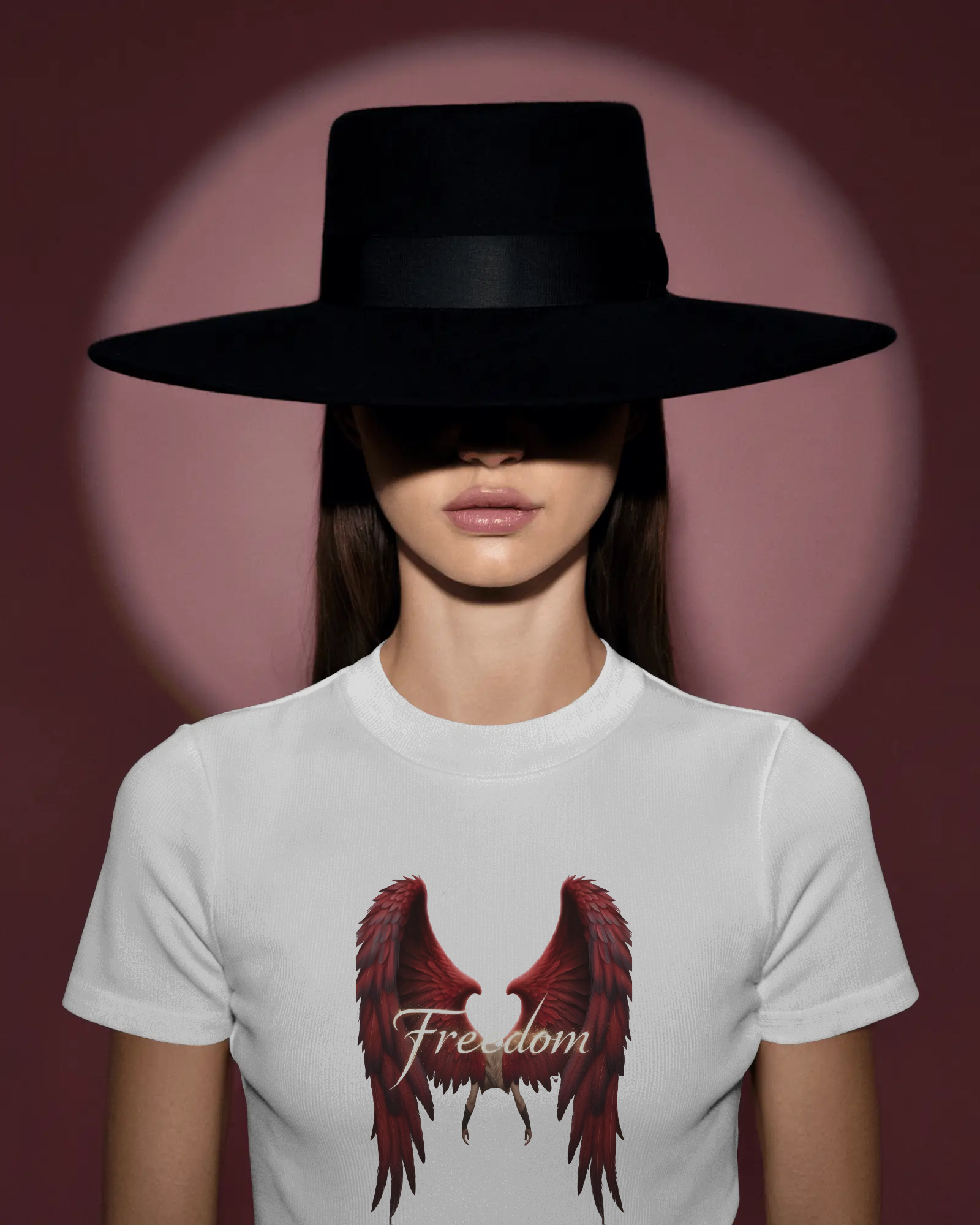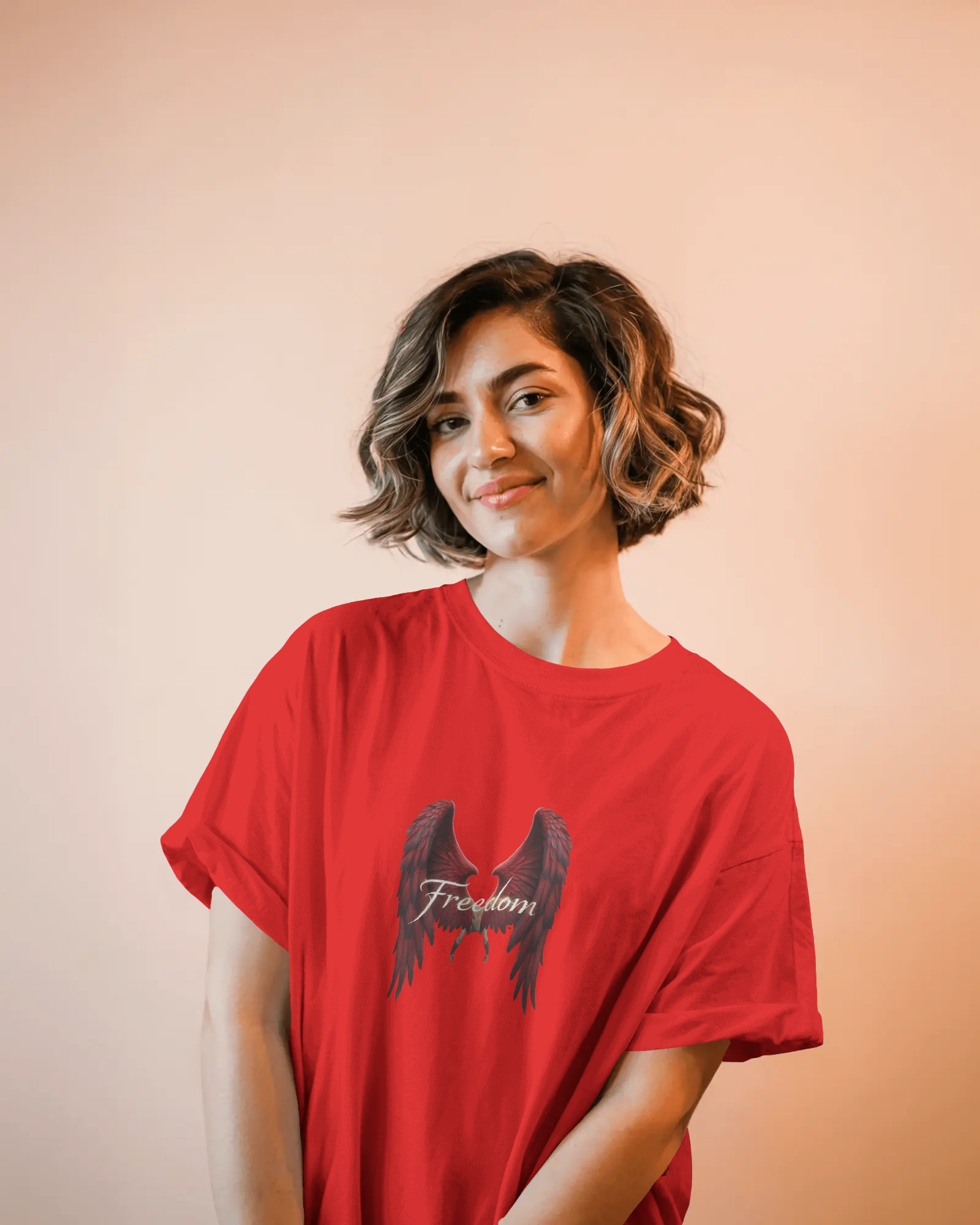 ✅ Iconic Freedom Wing Graphic – Featuring vibrant red wings with detailed feathers, framing the word "Freedom" in elegant cursive, symbolizing strength and liberation! 🕊️✨