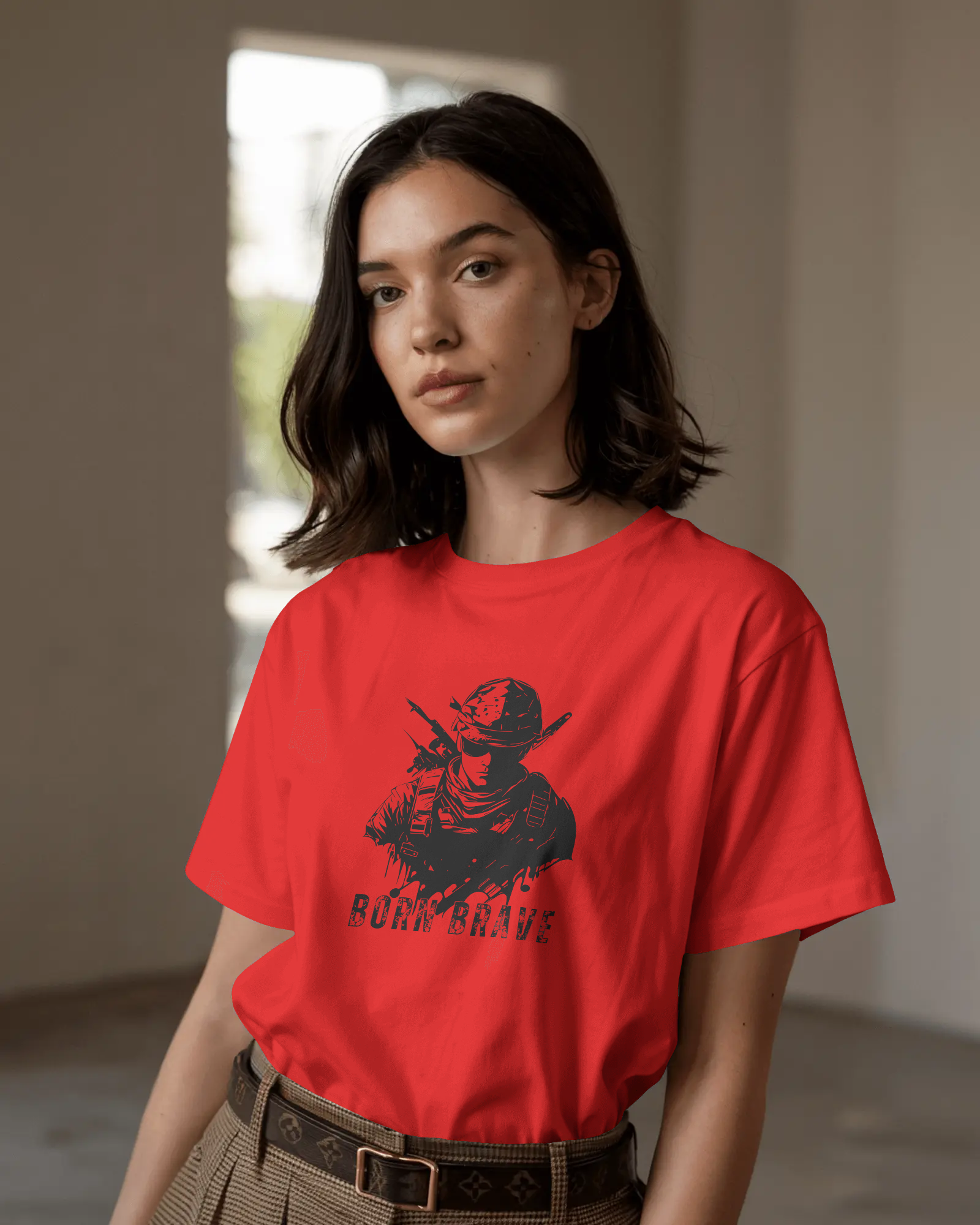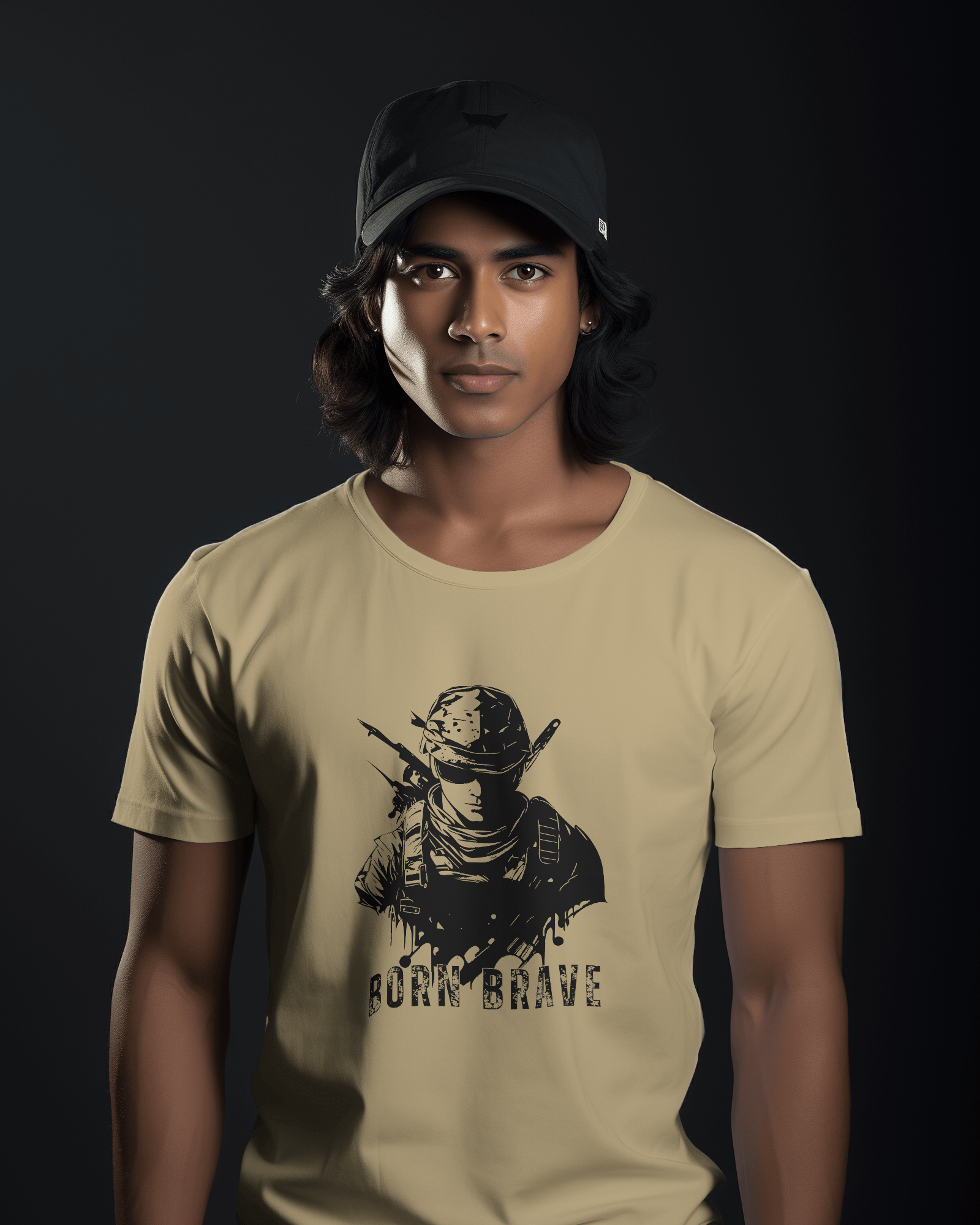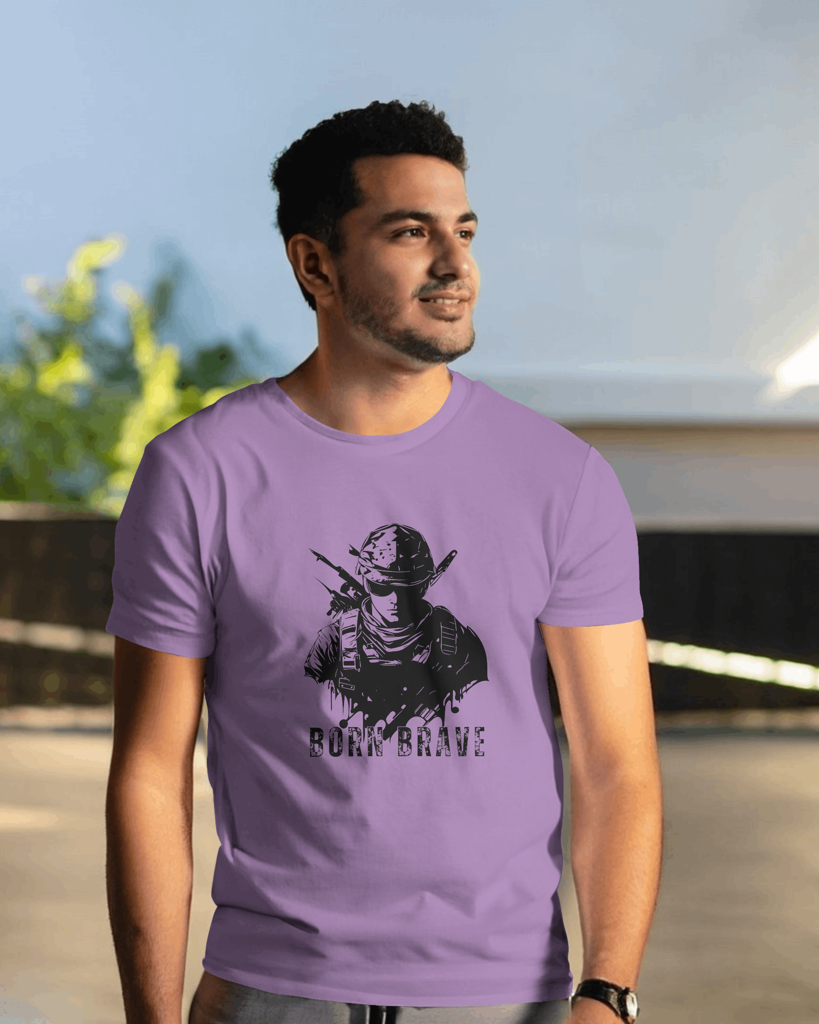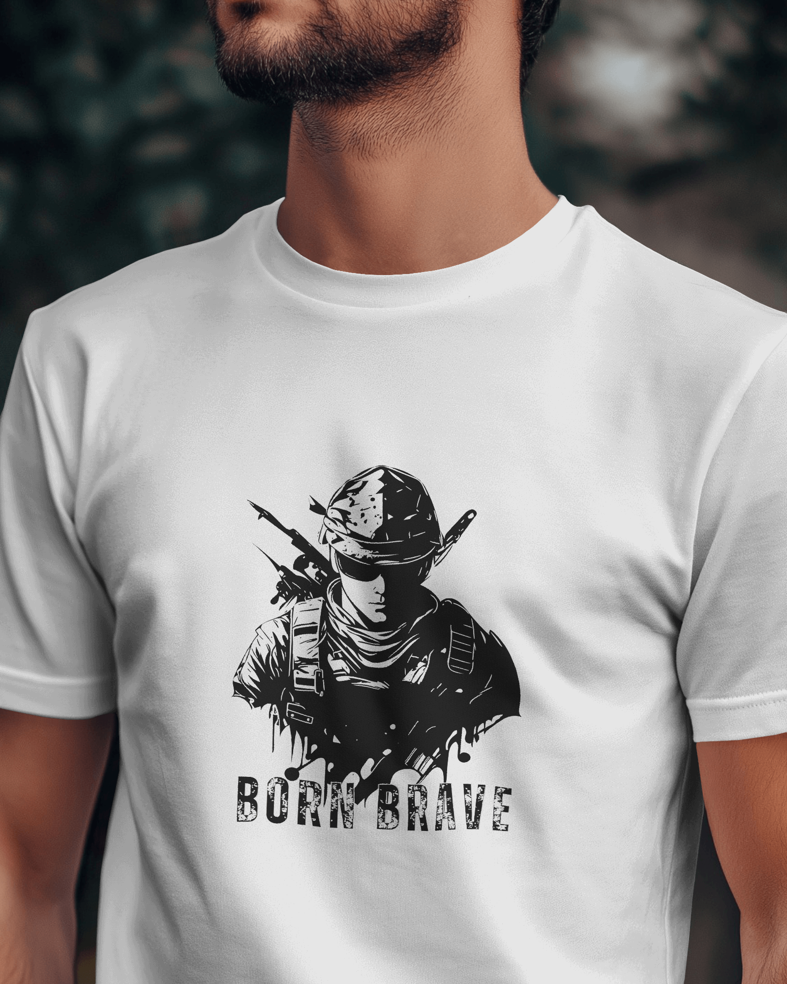 The compelling 'Born Brave' graphic, prominently featured on the chest, showcases a determined, soldier-like figure, embodying readiness and resilience, underscored by the powerful 'BORN BRAVE' text. This unique design blends a tactical aesthetic with an inspiring message, making it a strong visual declaration of your inner fortitude and fearless attitude. With its classic regular fit, this tee offers a timeless silhouette that perfectly highlights the commanding graphic.