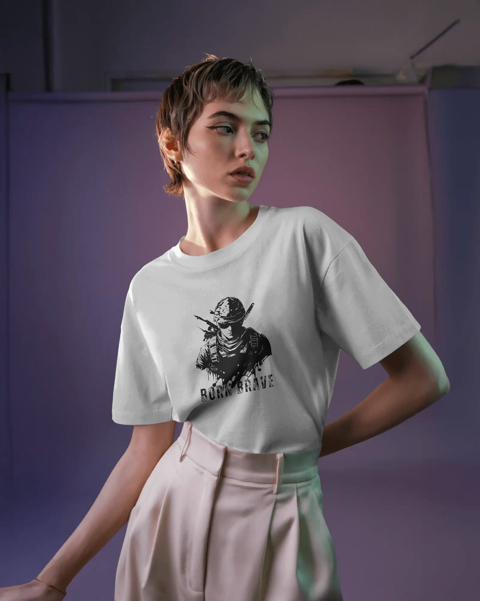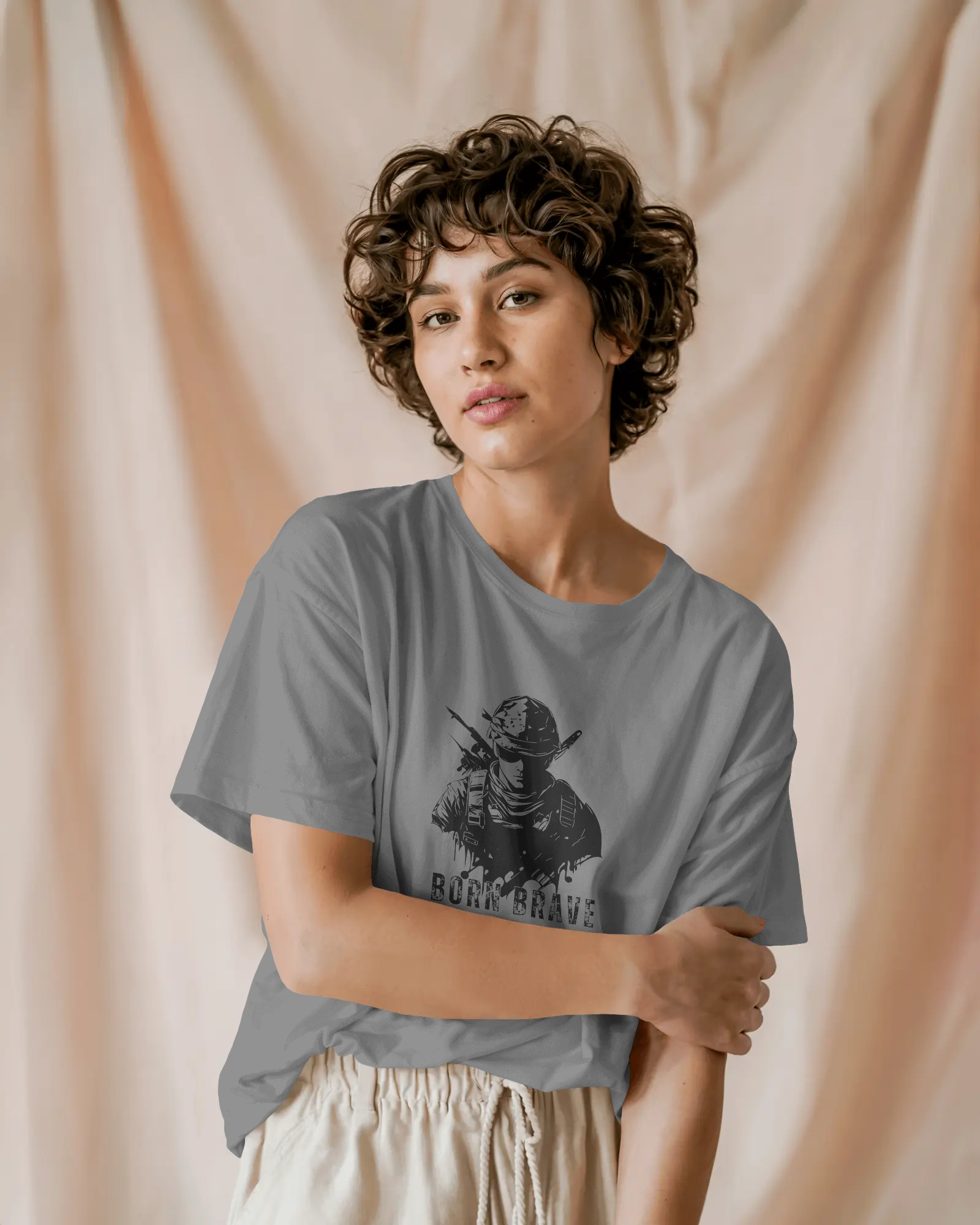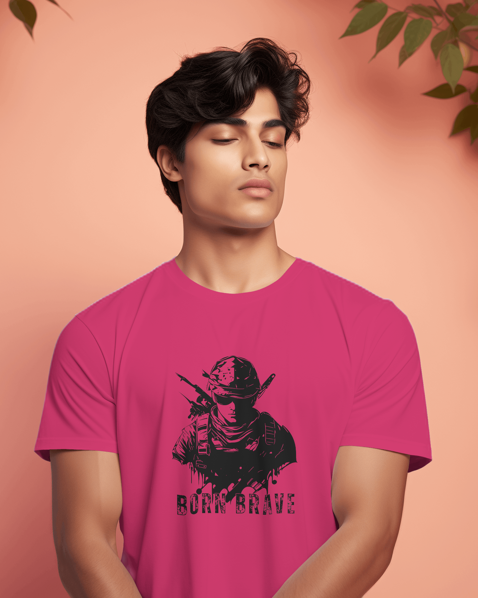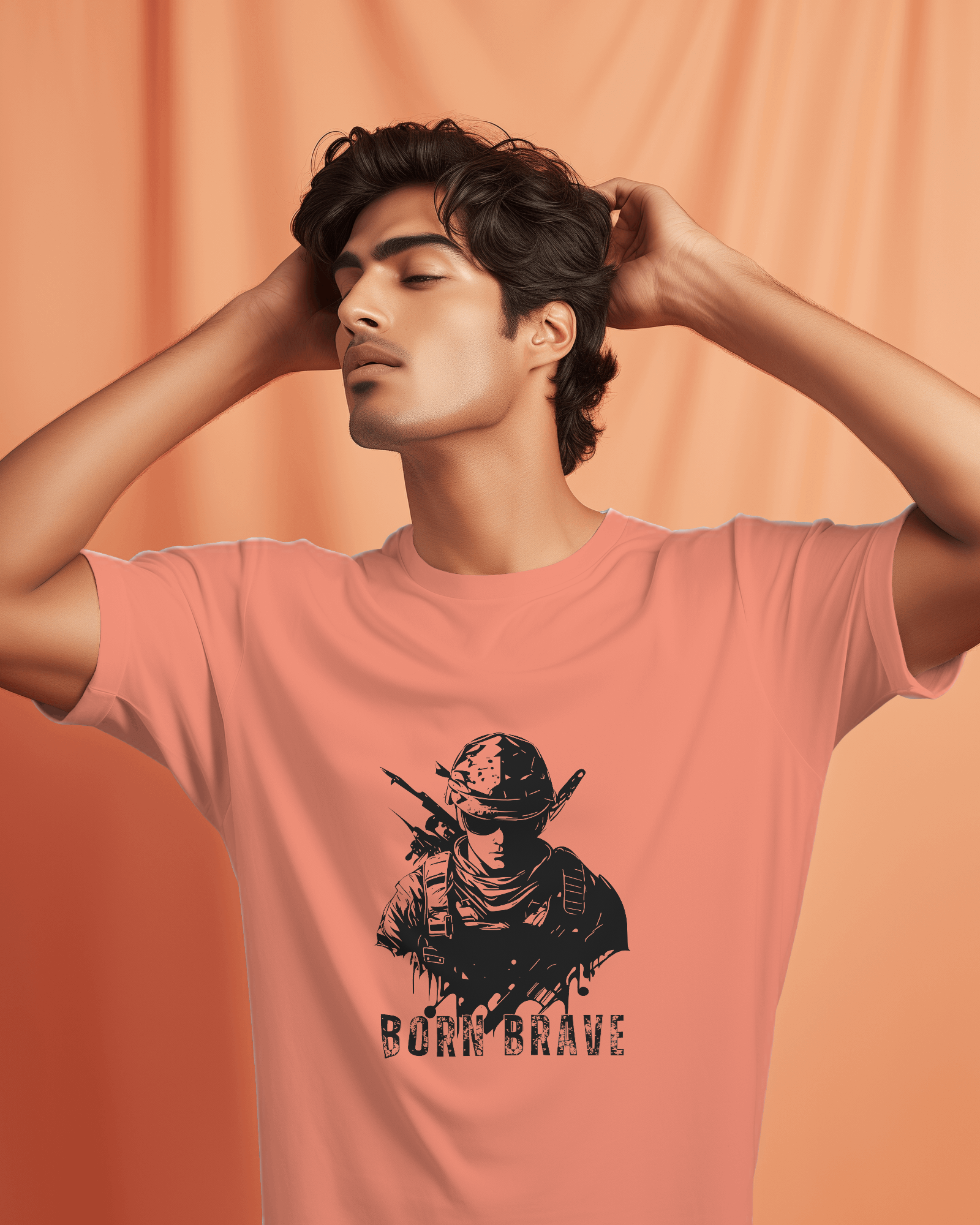 The compelling 'Born Brave' graphic, prominently featured on the chest, showcases a determined, soldier-like figure, embodying readiness and resilience, underscored by the powerful 'BORN BRAVE' text. This unique design blends a tactical aesthetic with an inspiring message, making it a strong visual declaration of your inner fortitude and fearless attitude. With its classic regular fit, this tee offers a timeless silhouette that perfectly highlights the commanding graphic.