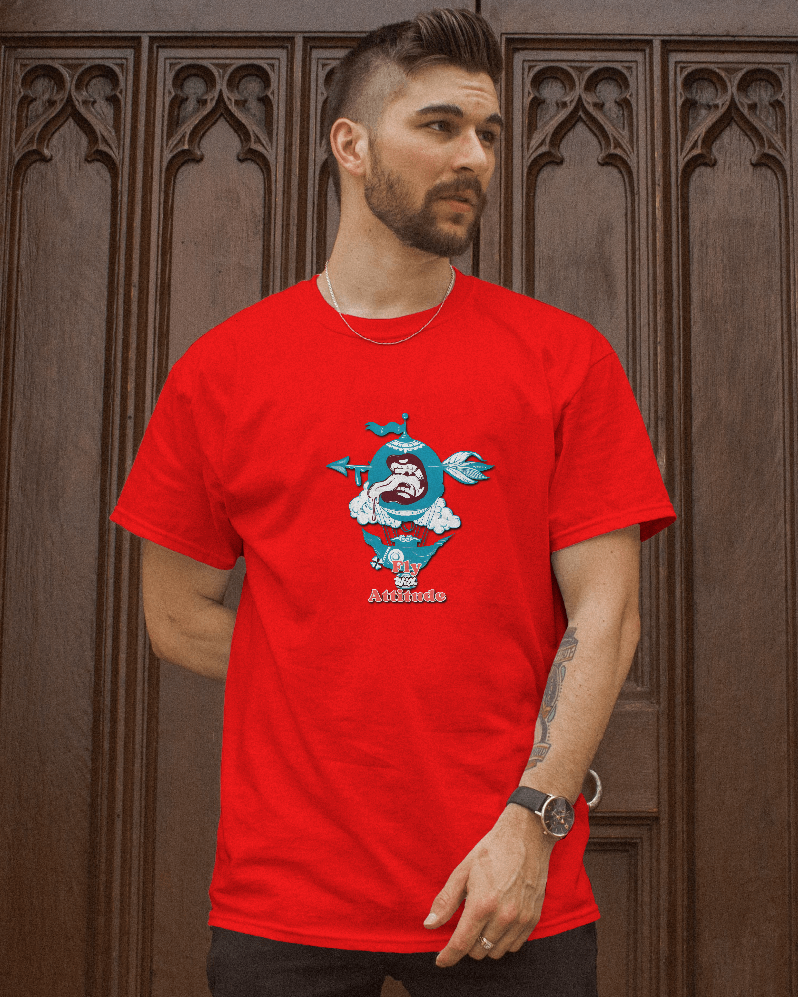 The compelling 'Attitude' graphic, prominently featured on the chest, showcases a striking central motif with bared teeth and an extended tongue, surrounded by dynamic, cloud-like forms and angular elements, all underscored by the bold 'Attitude' text. This unique design blends an edgy aesthetic with expressive artistry, making it a powerful visual declaration of individuality. With its classic regular fit, this tee offers a timeless silhouette that perfectly highlights the commanding graphic.