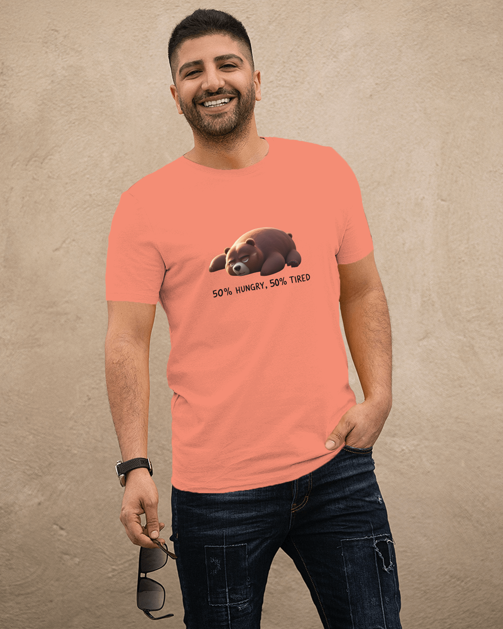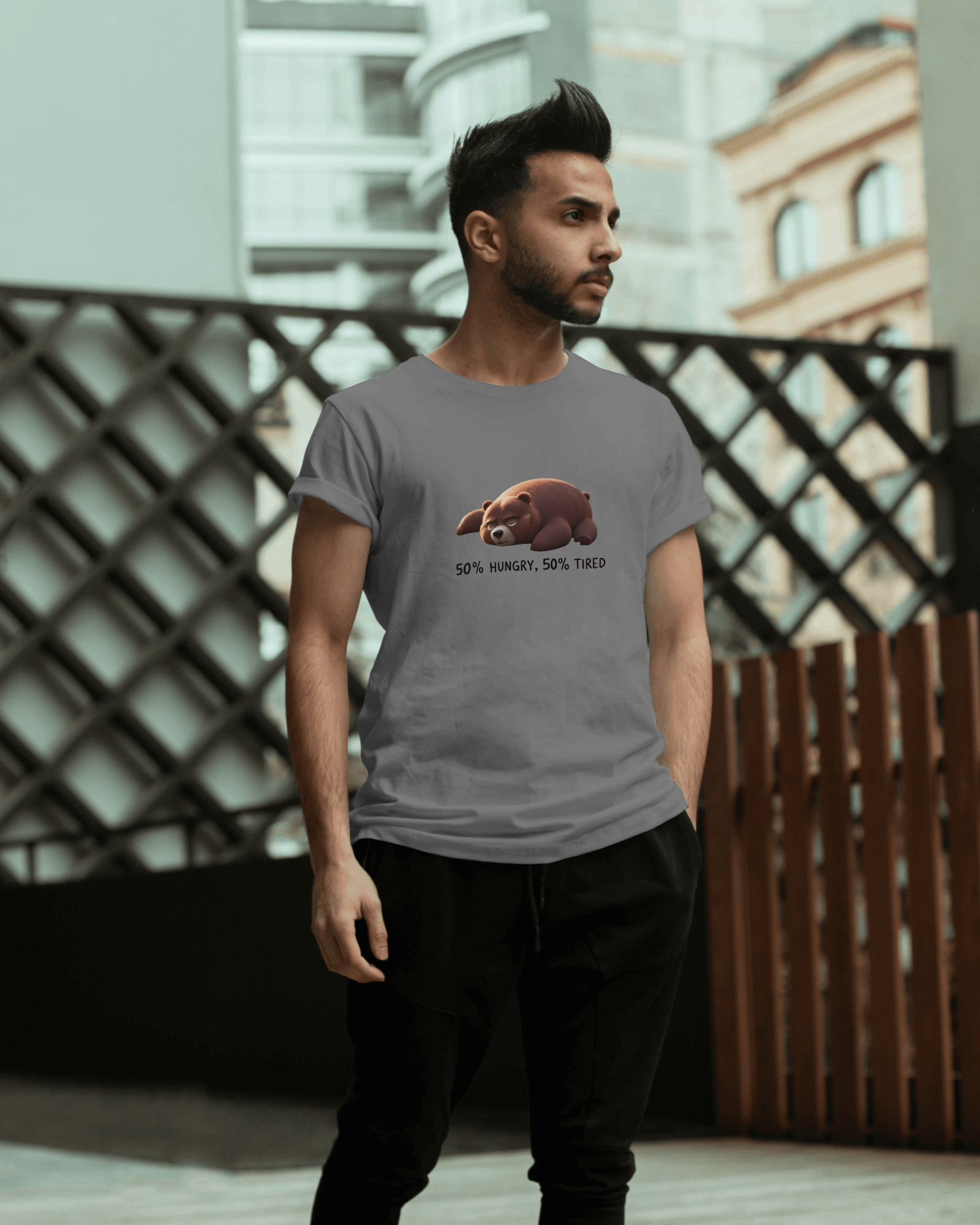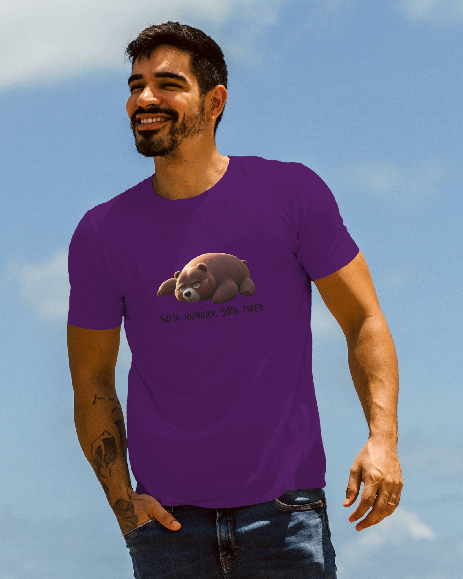 Earth & Thread | 50% Hungry 50% Tired Bear 100% Cotton Regular Fit T-Shirt - Premium 180 GSM Humorous Graphic