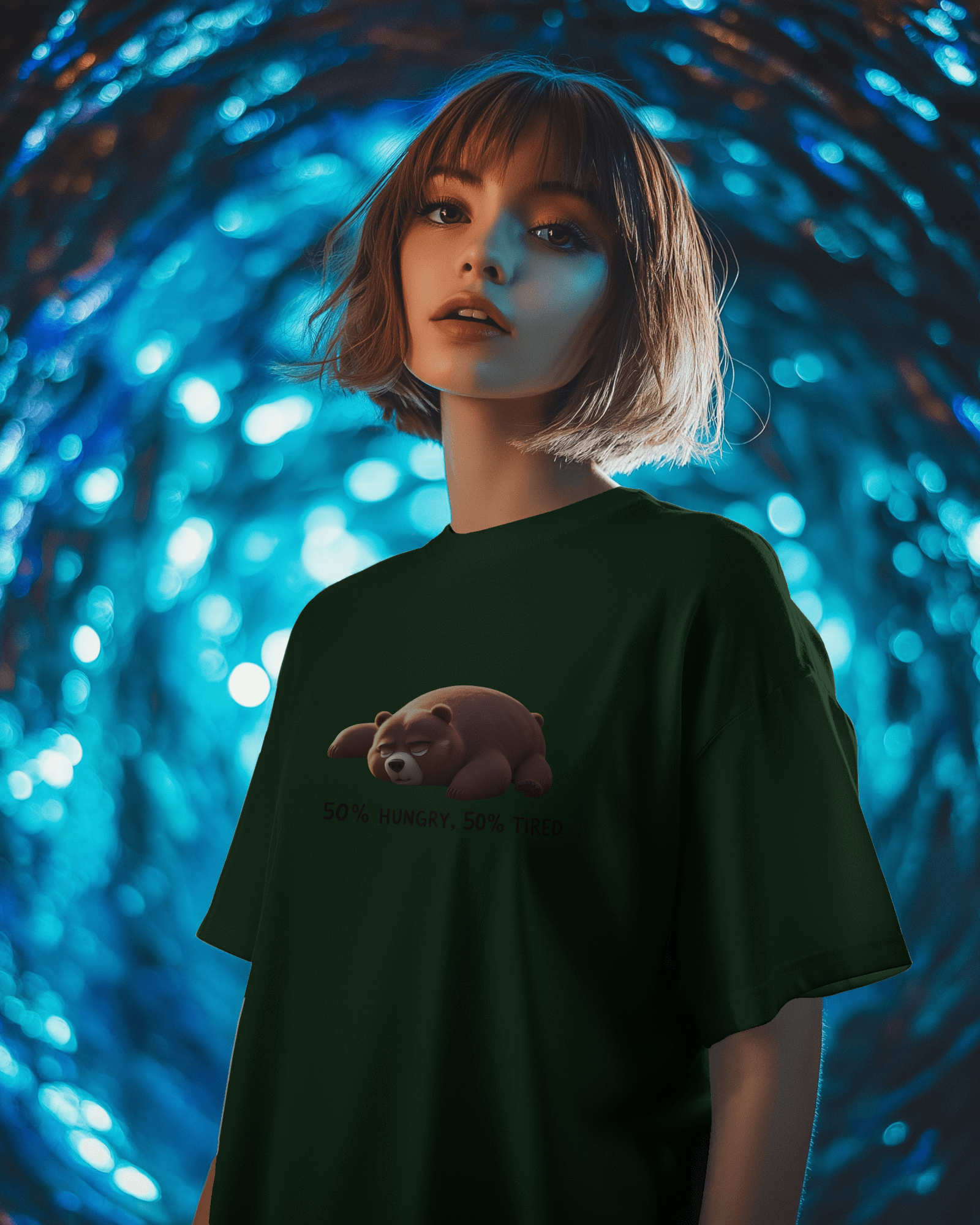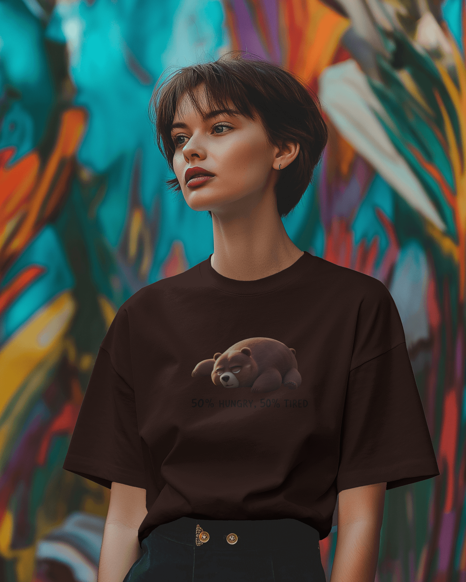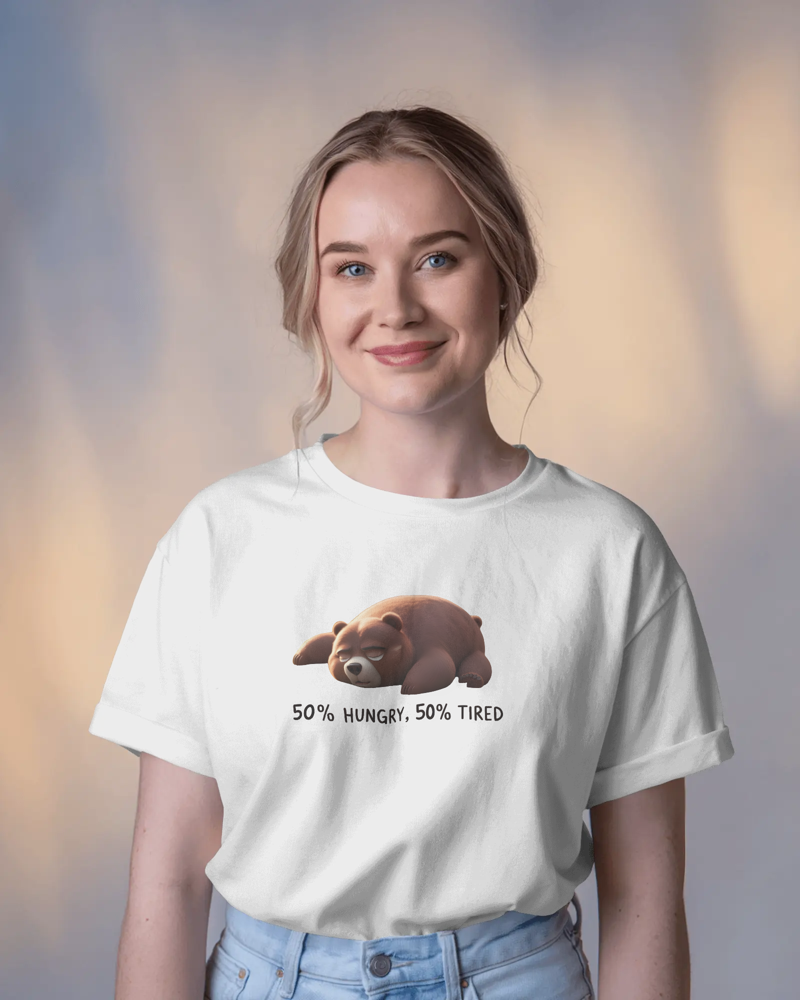 The captivating '50% Hungry, 50% Tired Bear' graphic, prominently featured on the chest, showcases an adorable, sleepy brown bear, accompanied by the perfectly witty text. This isn't just a design; it's a moment of shared understanding, a lighthearted nod to life's persistent cravings and fatigue, delivered with irresistible charm. With its classic regular fit, this tee offers a timeless silhouette that perfectly highlights the endearing graphic.